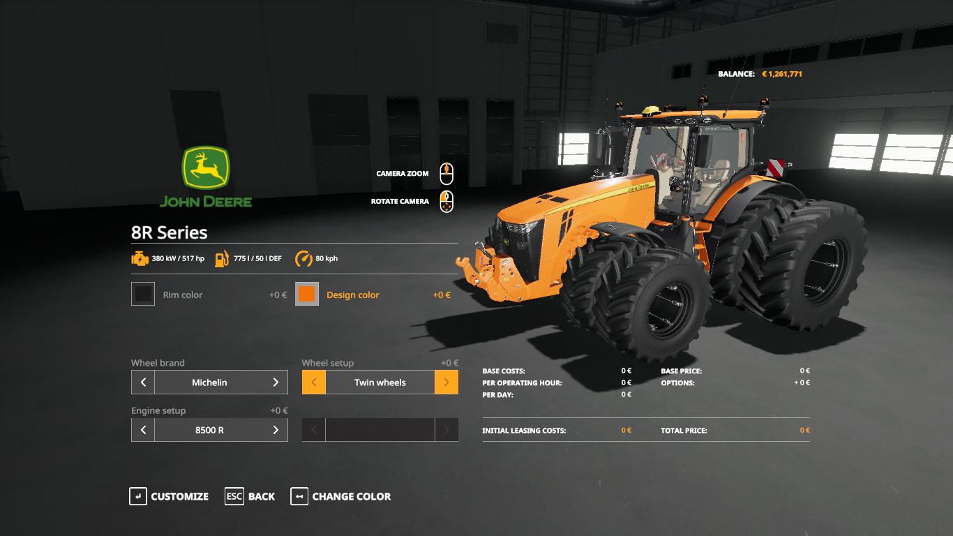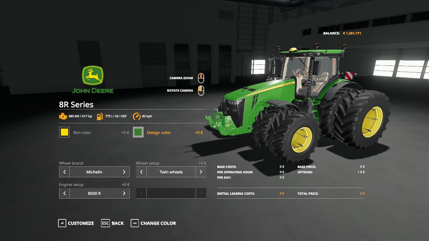 John Deere 8R Series by Stevie for FS 19 The choice of colors for the cab and disks is added, faster speed of movement, 517hp engine configuration added, steering increased, flashing lights added, rear camera corrected and store price reduced. Credits: Stevie |