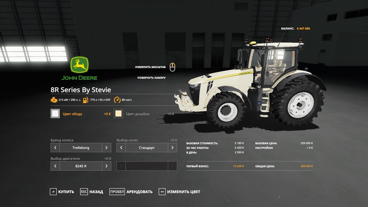 Power 290 hp, max. speed 80 km / h, price 259000, wheel selection, lighting, engine selection, animation, rim color selection, rear-view camera, soiled and washed, wear, animation of controls. Credits: Stevie |