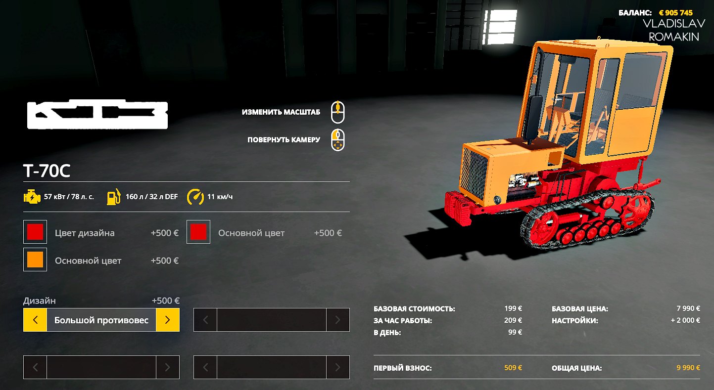 MOD KTZ T-70C V1.0.0.0 FOR FARMING SIMULATOR 2019 - Engine: D-241L - Power: 57 kW / 78 forces - Fuel tank capacity: 160 liters - Price: 7990 euros - Choice of body color when buying - Choosing a frame color when buying - Choosing a design when buying - Lighting equipment, instrument panel lighting - Gets dirty and washes from dirt - The gauges on the dashboard are animated - When it rains, the wipers work. Authors: AndreyGunko / Silak_68 / werik / Vyacheslav Prokudin / Adsumus. Envelope in FS19: VLADISLAV ROMAKIN.