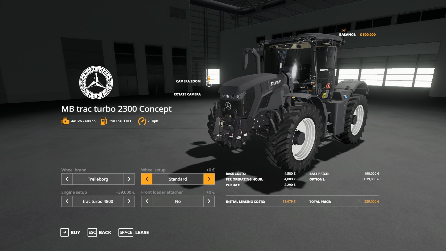 The initial price is 190,000, engine selection power is 275 and 600 hp, wheel selection, front device selection and other standard features. Credits: Giants Software |