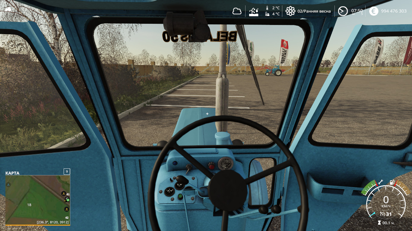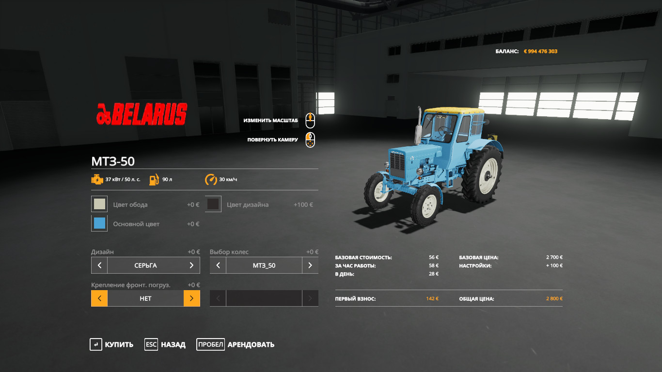 MOD MTZ-50 V1.0.0.0 FOR FARMING SIMULATOR 2019 Features of the mod - Price: 2700 €; - Power: 37 kW / 50 HP; - Speed: 30 km / h; - The volume of the fuel tank: 90 liters; - Choice of the main color; - Choice of design color; - Choice of wheels; - Animated cooling fan; - Working lighting equipment; - Working mirrors; - Leaves traces; - Gets dirty and washed; - Support for IC script (Open doors and hood flap); - Three types of fastening front. loader.
