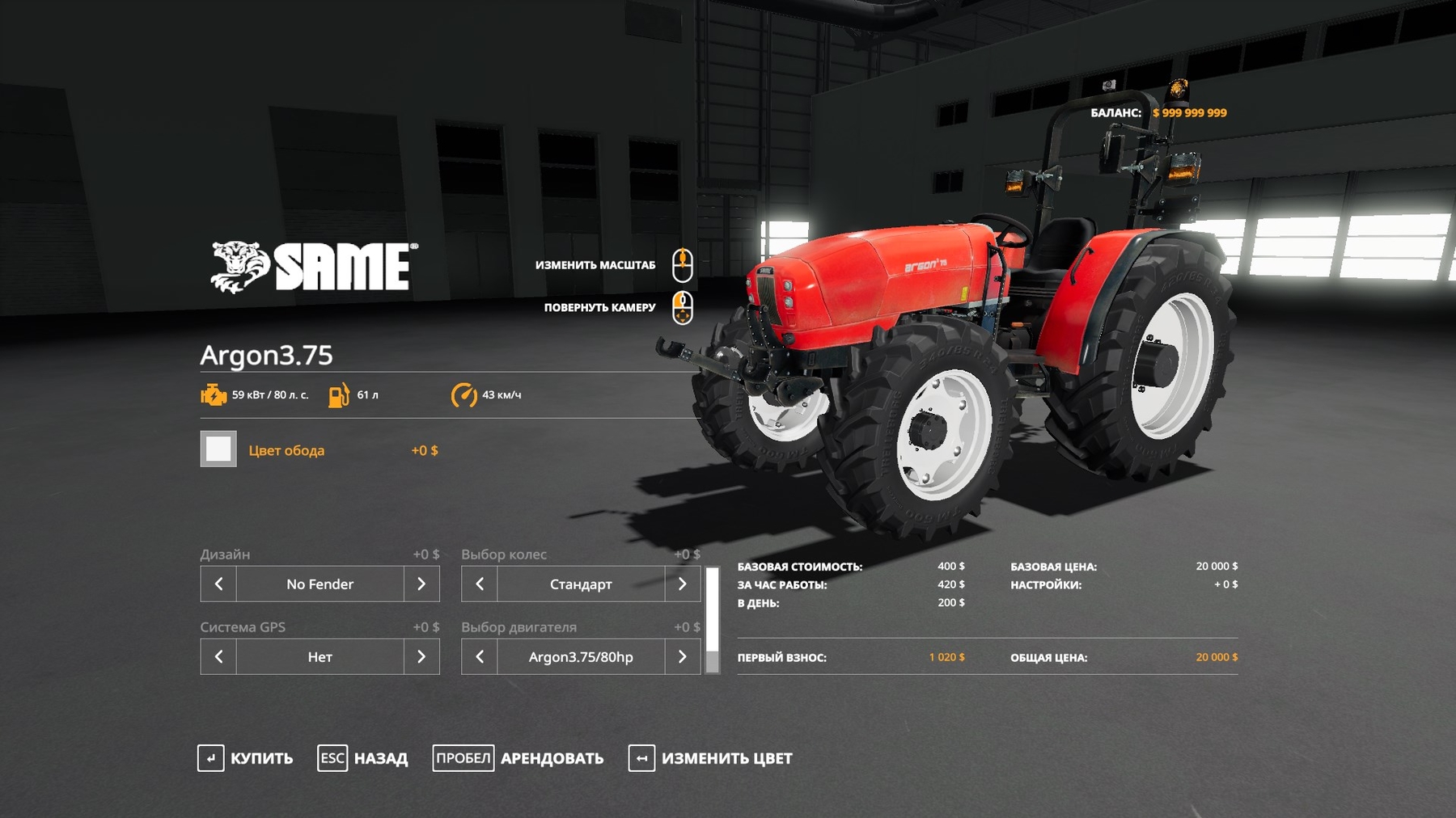 Mod SAME ARGON 3.75 V1.0.0.2 for Farming Simulator 2019 Light tractor Same Argon 3.75. Price 20,000, power 80 hp, max speed 45 km / h. Credits: Ultra_Tonio_Modding,conv.Niknab |