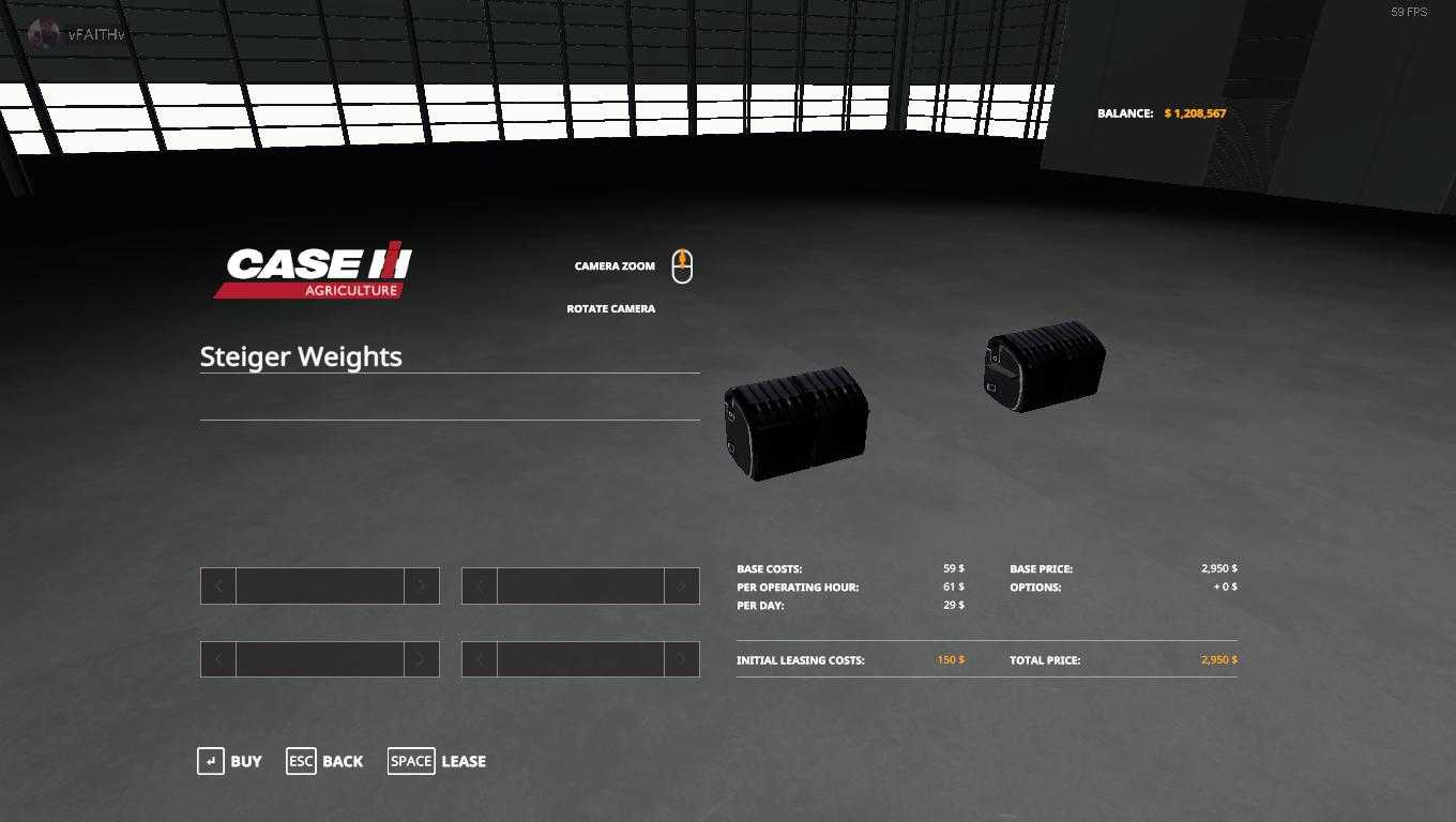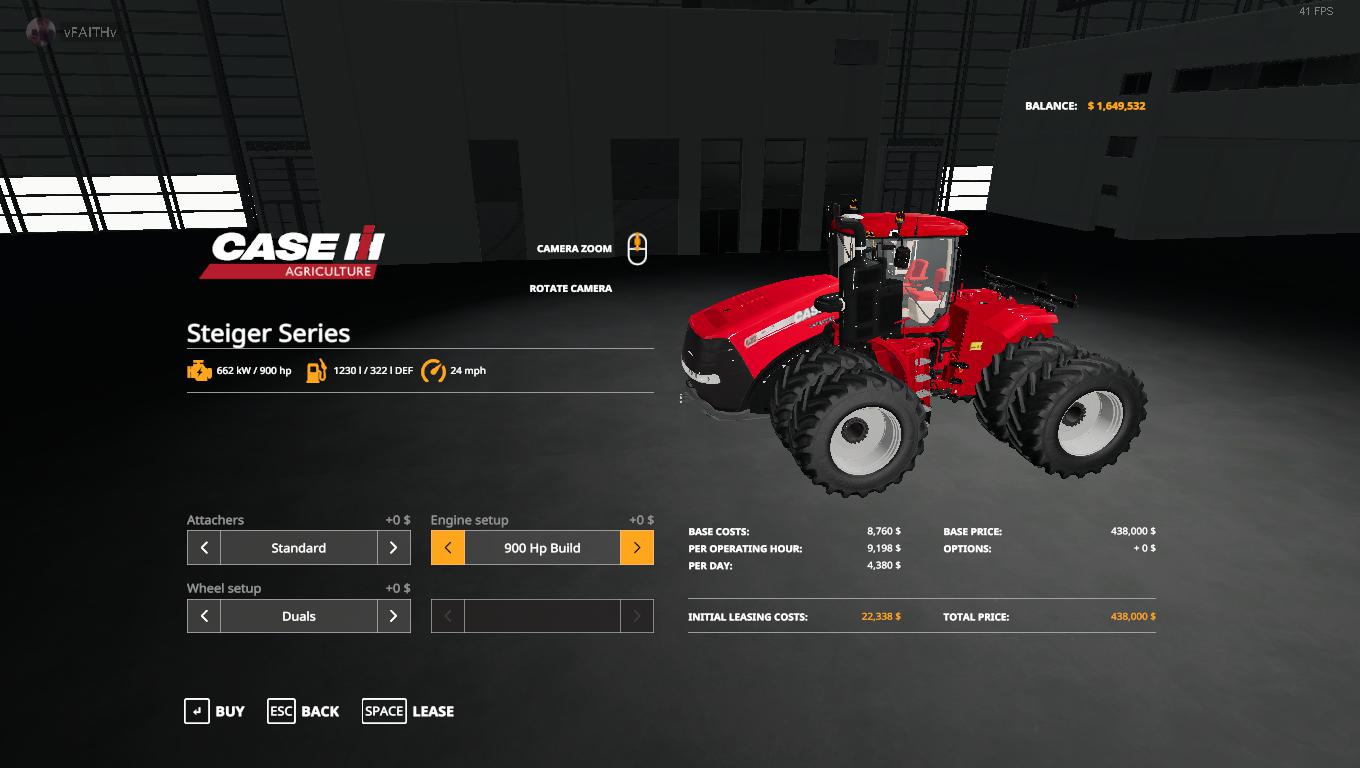 Case IH Steiger series with removable Case Weight for FS 19. Power 525, max. speed 40, price 438000, engine selection. Credits: vFAITHv / JASON |