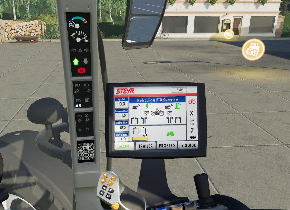 - Hydraulics and PTO control (animated buttons and levers)