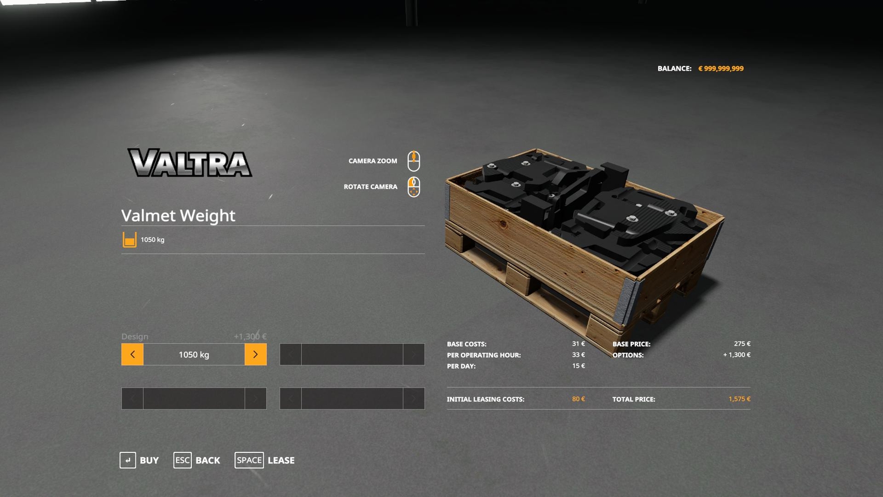 A separately purchased front counterweight kit with several counterweight options from 150 kg to 1050 kg. |