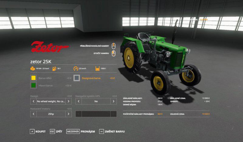 MOD ZETOR 25K V1.0.0.0 FOR FARMING SIMULATOR 2019 Choice of color (basic, design and rim), engine configuration, removable cab.