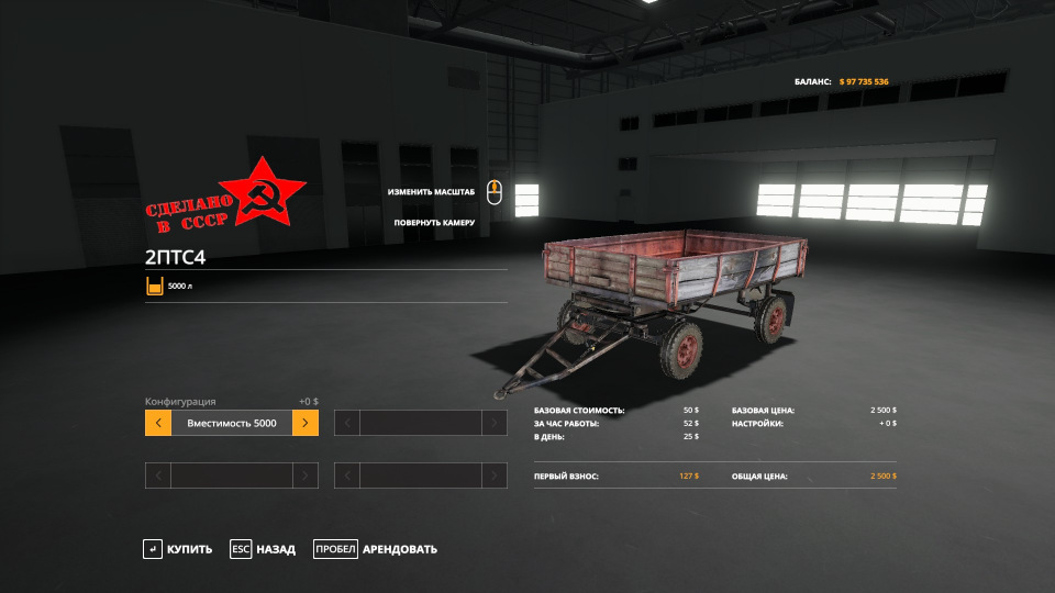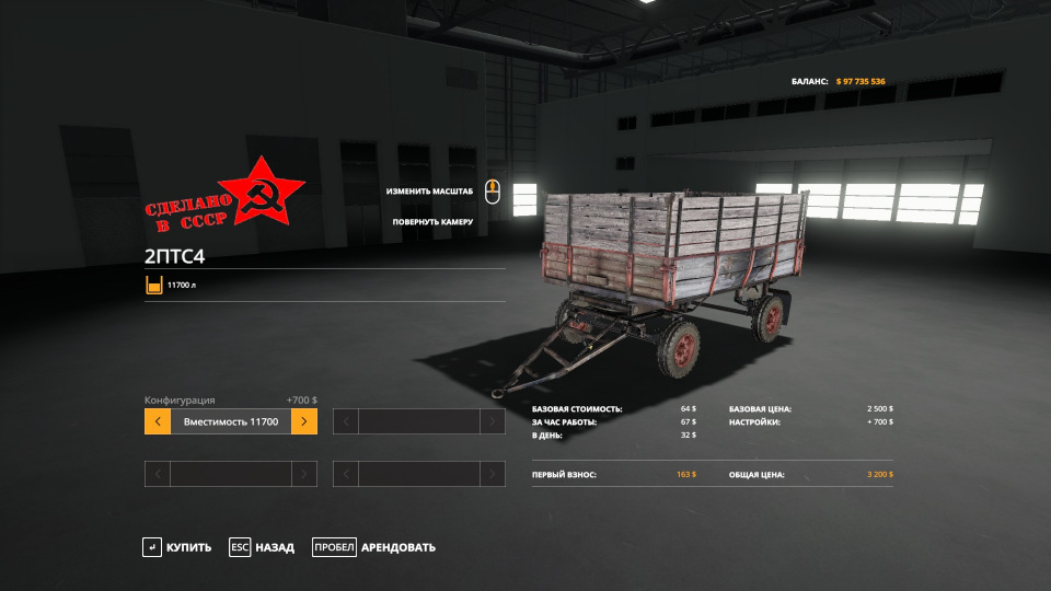The trailer has 3 configuration options: 5,000 liters - standard weights., 11,700 liters - for hay, straw, chops, etc., an option - a platform with fastening straps. Dynamic hoses. Working lighting. Collisions of the sides (you can carry firewood). Unloading on 3 sides (the platform is disabled). Price - 2 500. Soiled and washed. Credits: JEKOS, Maksim_93, umbrella666 |