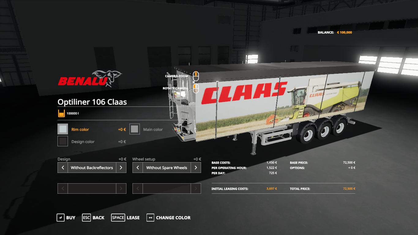 Mod Benalu Tipper Claas v1.0.0.0 for Farming Simulator 2019 Capacity: 63,000 L - Price: 72,500 - Press X to expand the ladder (you can climb it to look at the truck) - Lifting axle - Selecting a color for the trailer, cover and rims - Configuring reflectors on the rear doors - Configuring spare wheels . Remember that this is a trailer with a dump truck, which may not be suitable for small buildings. The tipping angle is 37 ° (normal) or 18 ° (tipping through Graindoor). Maximum. tipping height is 9.6 m (normal) or 7.1 m (tipping through the grindur), which is close to real world values. Credits: CrowerCZ |