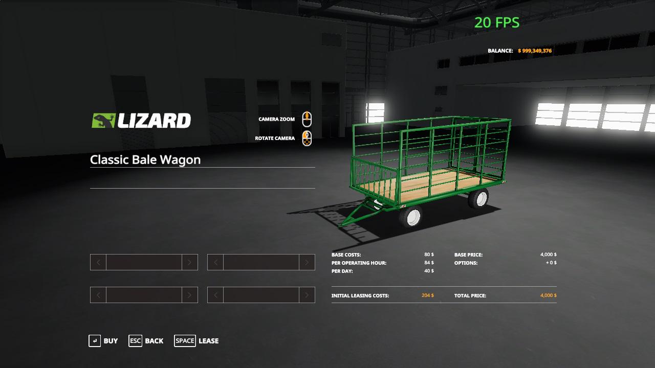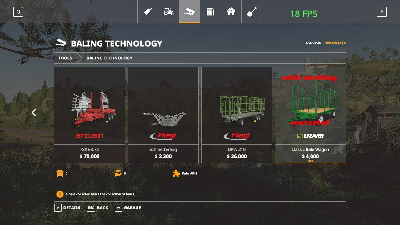 Мod Classic bale wagon v1.0 for Farming Simulator 2019 Has fastening straps in front to hold bales in a trailer. All animations work, and he can push the bales back when you press x to open and close. The cost is 4000, and the rent is 204. Credits: adub modding |