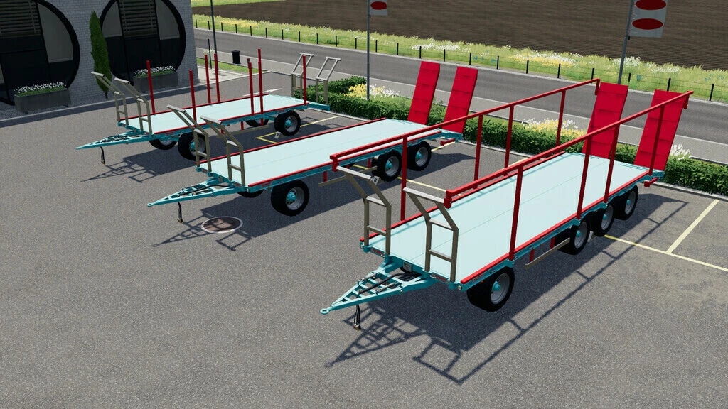 Bale trailers for manual or automatic bale transport supporting different bale sizes and positions. The trailers is ideal for the transport of round bales and square bales, but it is also possible to transport vehicles and objects. With the autoload version the straps are not hooked but the bales remain blocked by the script. To use the straps unload the bales on the trailer and hook the straps. Automatic bale loading supports: round bales from 1.1 meters to 1.80 meters not in stack, round bales from 1.1 to 1.3 meters in stack, normal and large square bales.