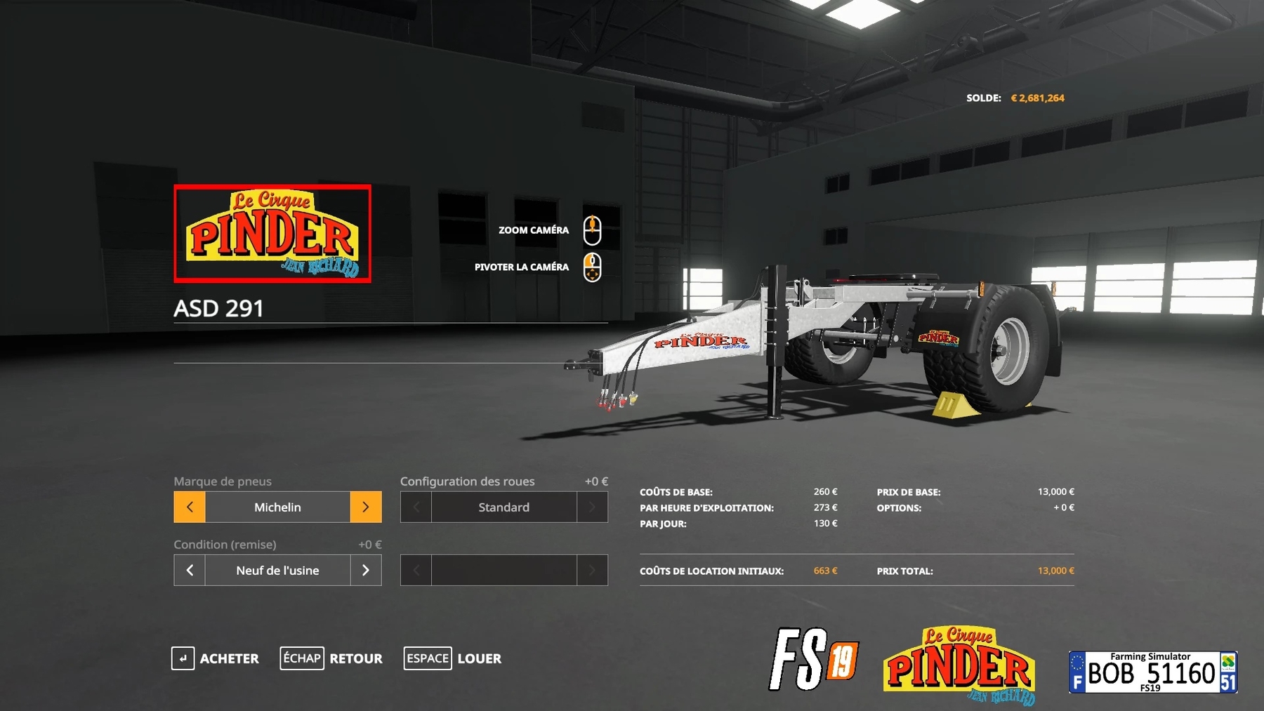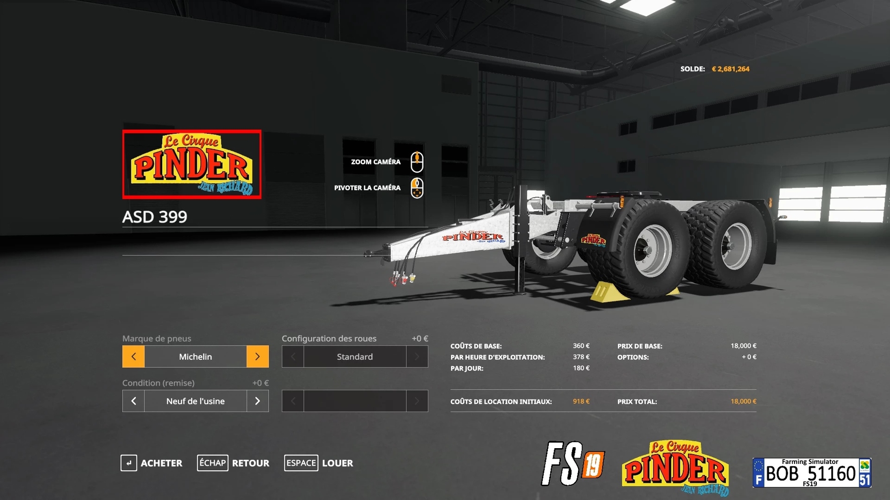 Mod Dolly Pinder By BOB51160 v1.0.0.0 for Farming Simulator 2019 Hello everyone, today I present to you the Dolly Pinder mod from BOB51160 for FS19, I think it will be useful for you to increase the circus caravan. Dolly Pinder, author of BOB51160 Single axle trolley ASD 291 Dolly ASD 399 tandem trolley Configurations: Credits: BOB51160 |