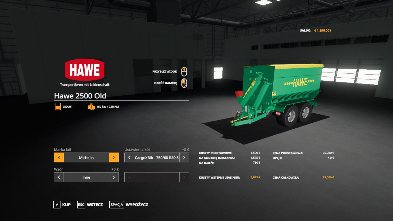 MOD HAWE ULW 2500 V1.0 FOR FARMING SIMULATOR 2019 Description: Original Hawe animation tube volume of 25,000 l; required power of 220 hp; gets dirty and washed Warning triangle of 10 types of wheels