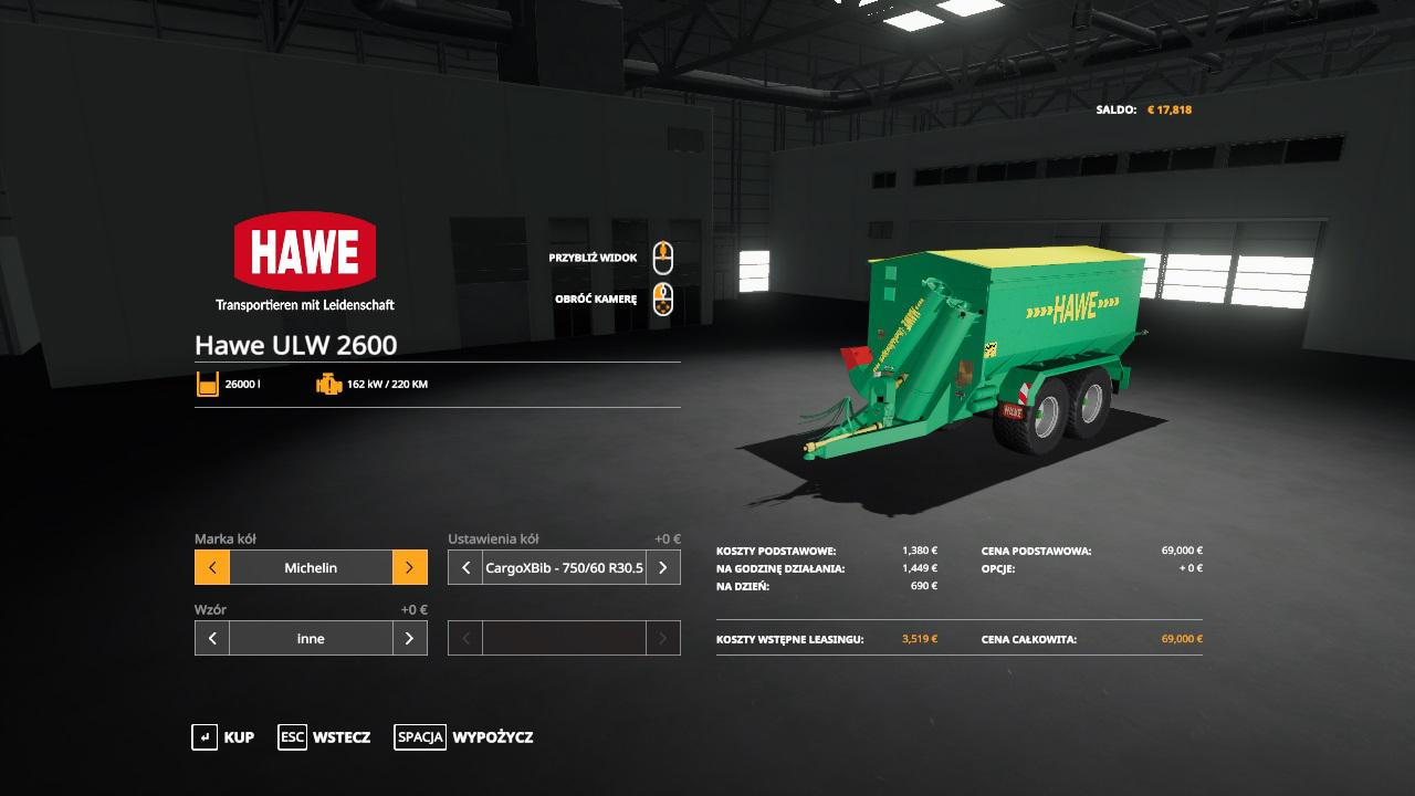 Mod HAWE ULW 2600 FINAL V3.0 for Farming Simulator 2019 New high-quality trailer for transporting crops. - Price: 69000 € - Capacity: 26000 liters - Power: 220 hp - Brand: Hawe - Choose the color of the wheels - Select the wheels Version 3.0 added: Animation, a new original pipe. Credits: Agrar |