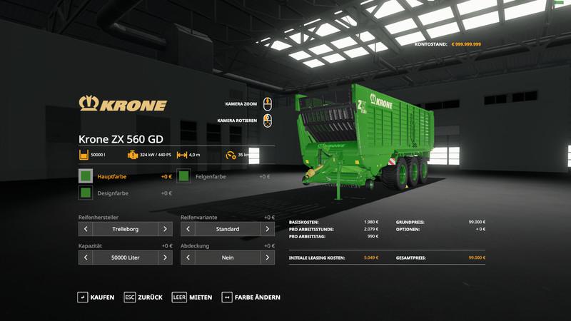 MOD KRONE ZX 560 GD V1.0.0.0 FOR FARMING SIMULATOR 2019 Krone ZX 560 GD with changed repair intervals, color selection, capacity selection, increased working width, unloading and working speed, and working speed. Credits: Giants/ Switty |