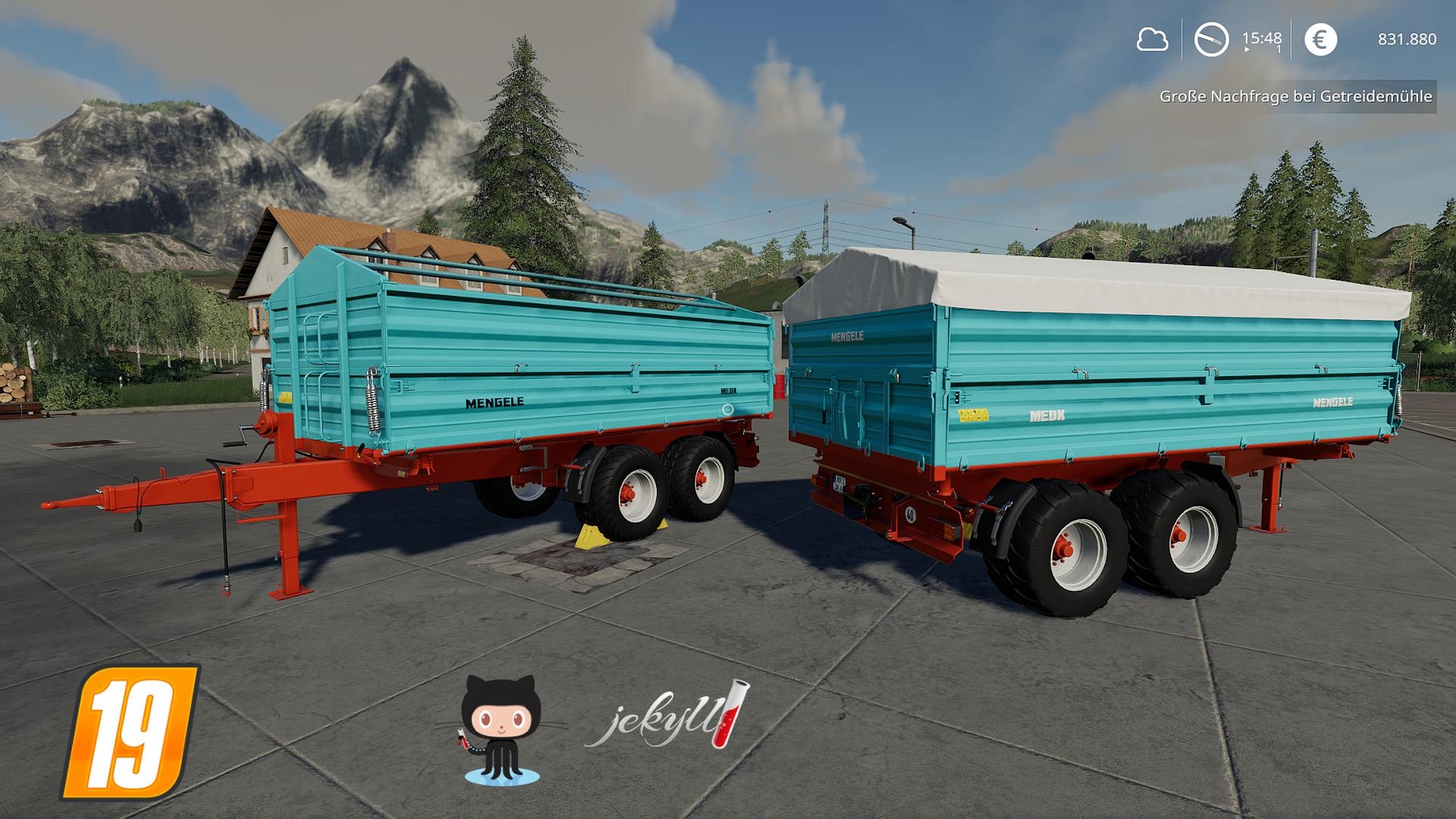 Two-axle trailer Mengele MEDK. Ideal for Mengele MZDK turntable trailer that already exists for the DL. Functions Tarpaulin selection Mengele Logos via Config in White and Black License plate u. Mounted shield 40 km / h Connection hoses (hydraulics, electrics) installed Rear connectors Additional racks fixed on canvas frame mod has the usual standard features Purchase price from € 19,500 depending on configuration Capacity: 14,000 liters Service intervals are extended Credits: Jekyll |