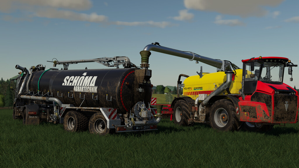 This package contains machines around a massive slurry tanker from Schöma in northern Germany. Thanks to the tapered reservoir, a very low center of gravity and excellent roadholding can be realized.