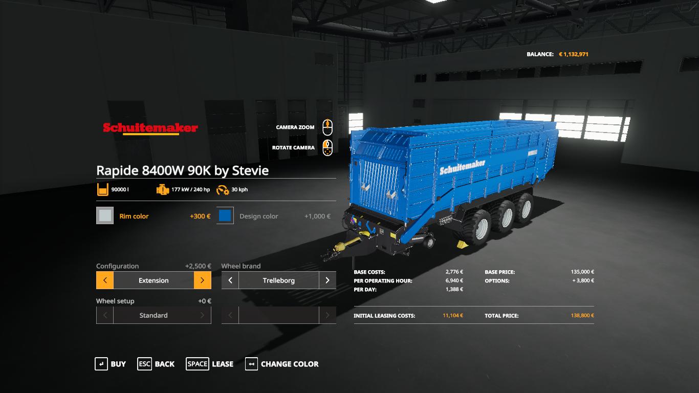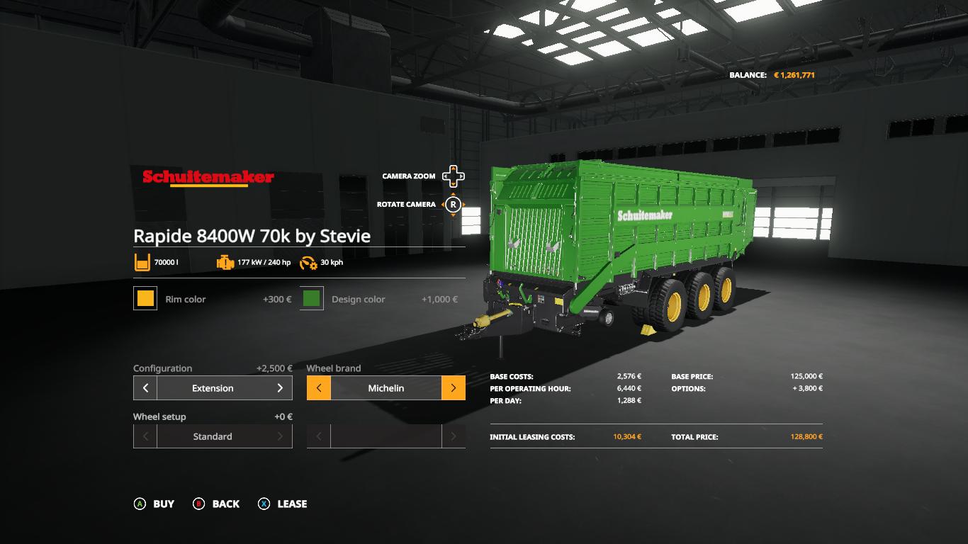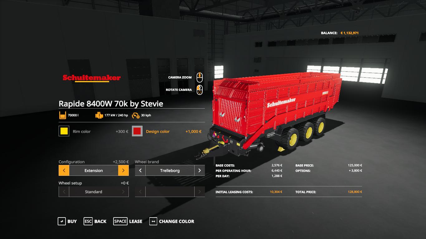 Schuitemaker Rapide8400w from Stevie for fs 19 Choice of color for the trailer and drive, faster working speed, faster unloading, wider pickup area, lower AI torque, wider wheels, 2 models 70k with extension and 90k with extension and reduced price in the store. Credits: Stevie |