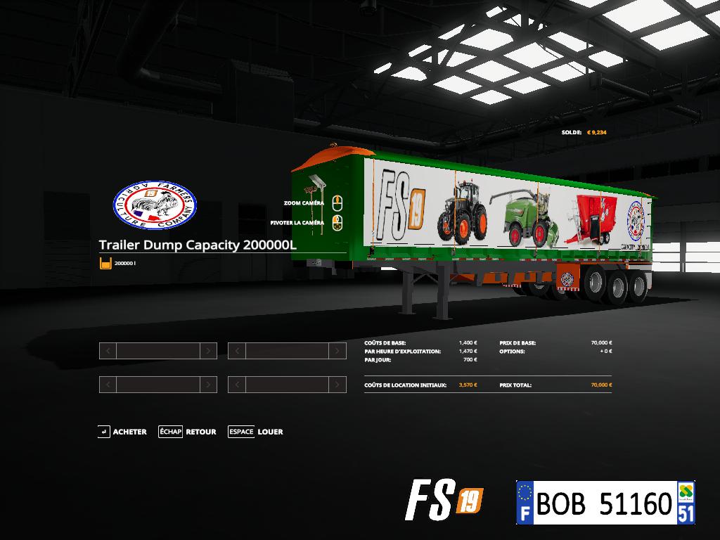 MOD TRAILER DUMP CAPACITY 200000L BY BOB51160 V1.0 FOR FARMING SIMULATOR 2019 Credits: BOB51160 |