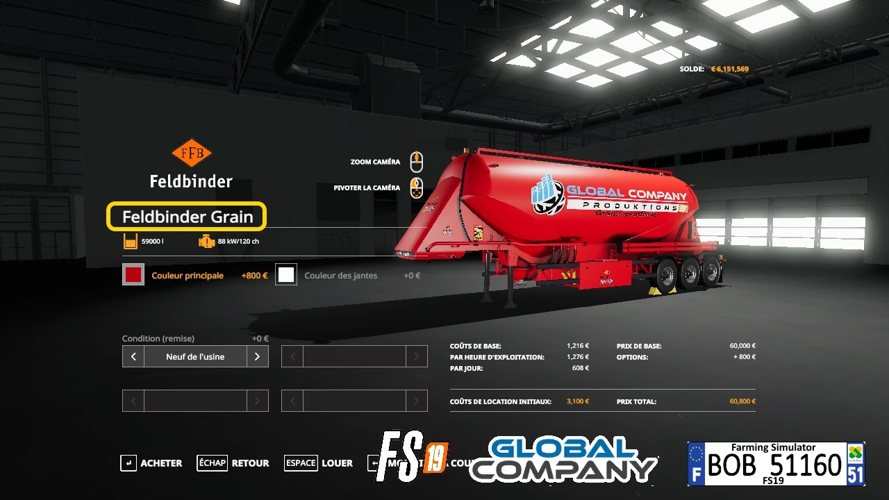 Mod TRAILER FELDBINDER BY BOB51160 V1.0.0.0 for Farming Simulator 2019 with a capacity of 59,000 liters and a cost of 65,000€ without additional options, you can change the color Credits: BOB51160 / Ap0lLo |