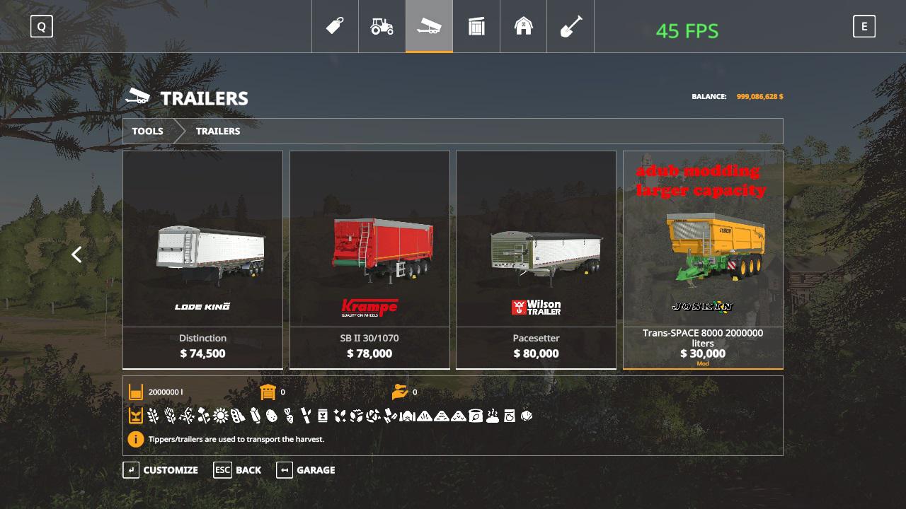Mod Transspace 8000 v3.0 for Farming Simulator 2019 This dump truck can accommodate 2,000,000 liters. You can also dump 100,000 liters per second. Added additional beacon. Credits: adub modding |