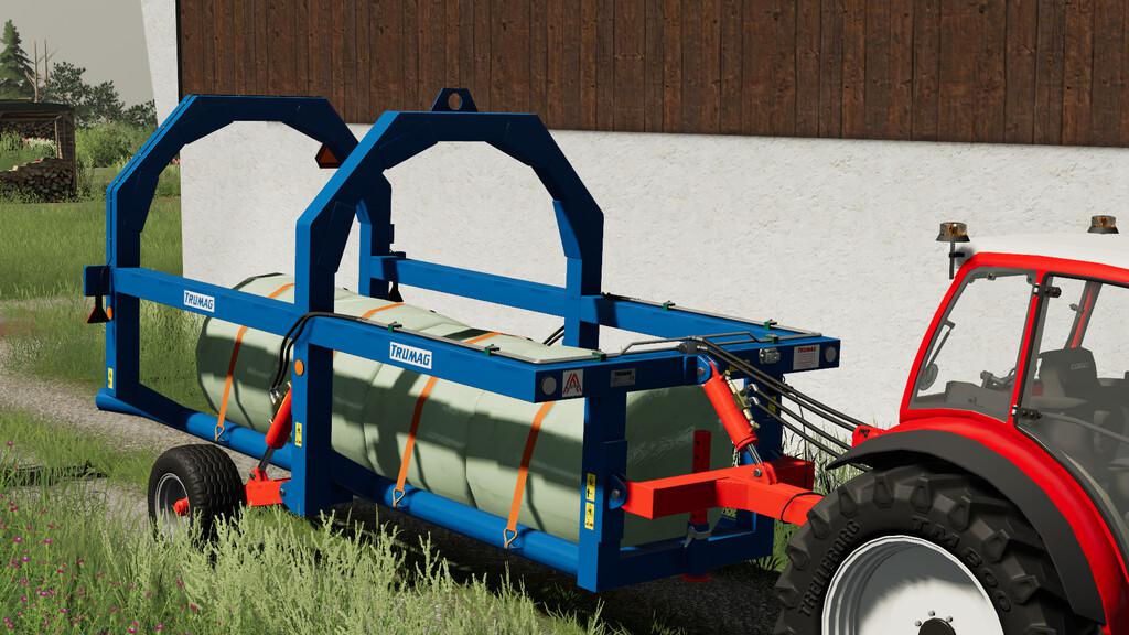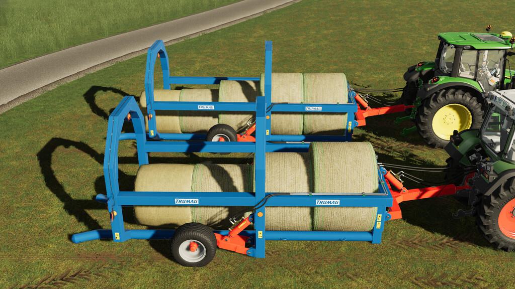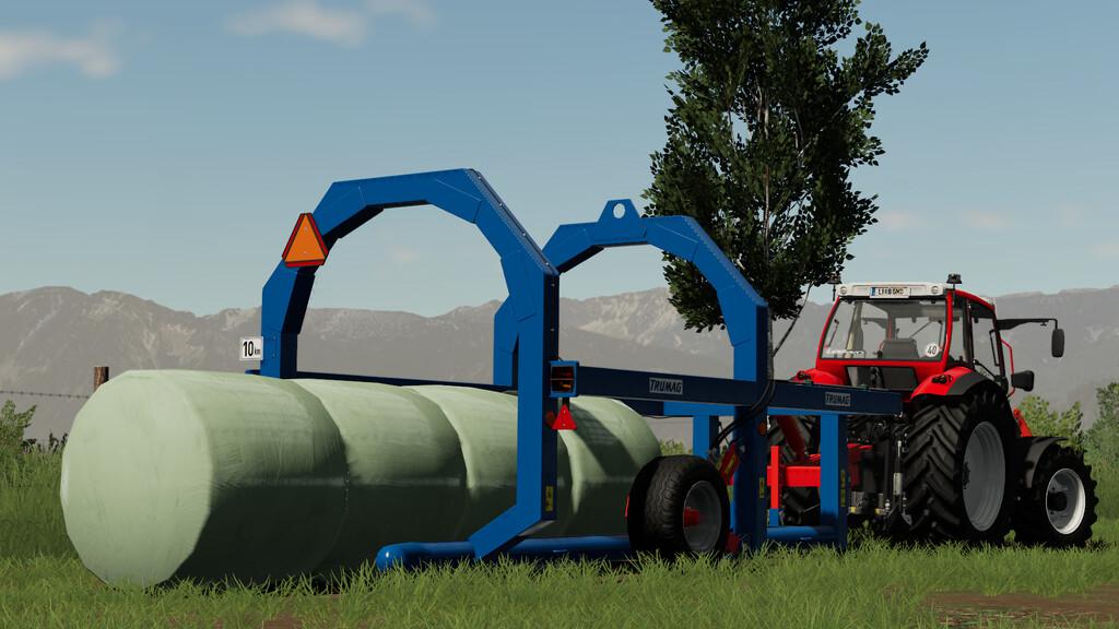 The RBTW round bale transporter from Trumag picks up round bales, wrapped or unwrapped, with a diameter of 1.3 m to 1.8 m.