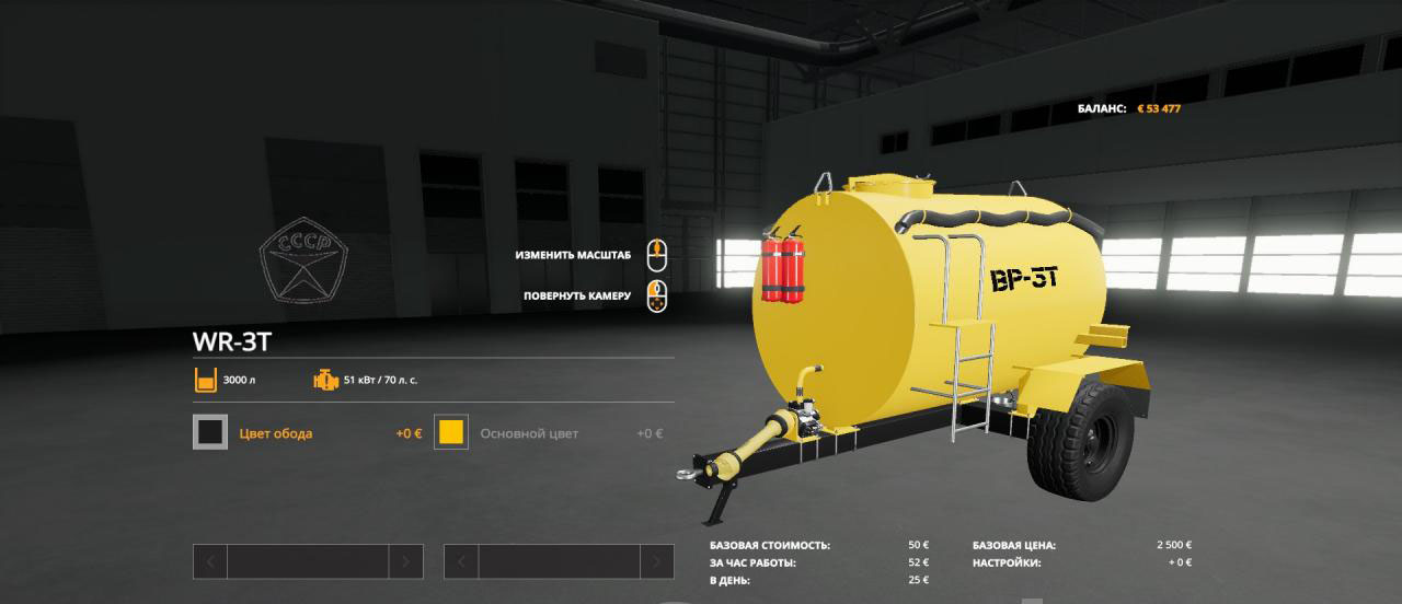 MOD VR-3T v1.0.0.0 for Farming Simulator 2019 Barrel for transporting liquids. Capacity for 3 cubic meters. Has a choice of base color, wheel rim color and lettering. It transports almost all liquids in the game. Can work in factories. There is a trigger for refueling equipment. Gets dirty and washable. There is wear with the shader from Kirill. Credits: YURI |