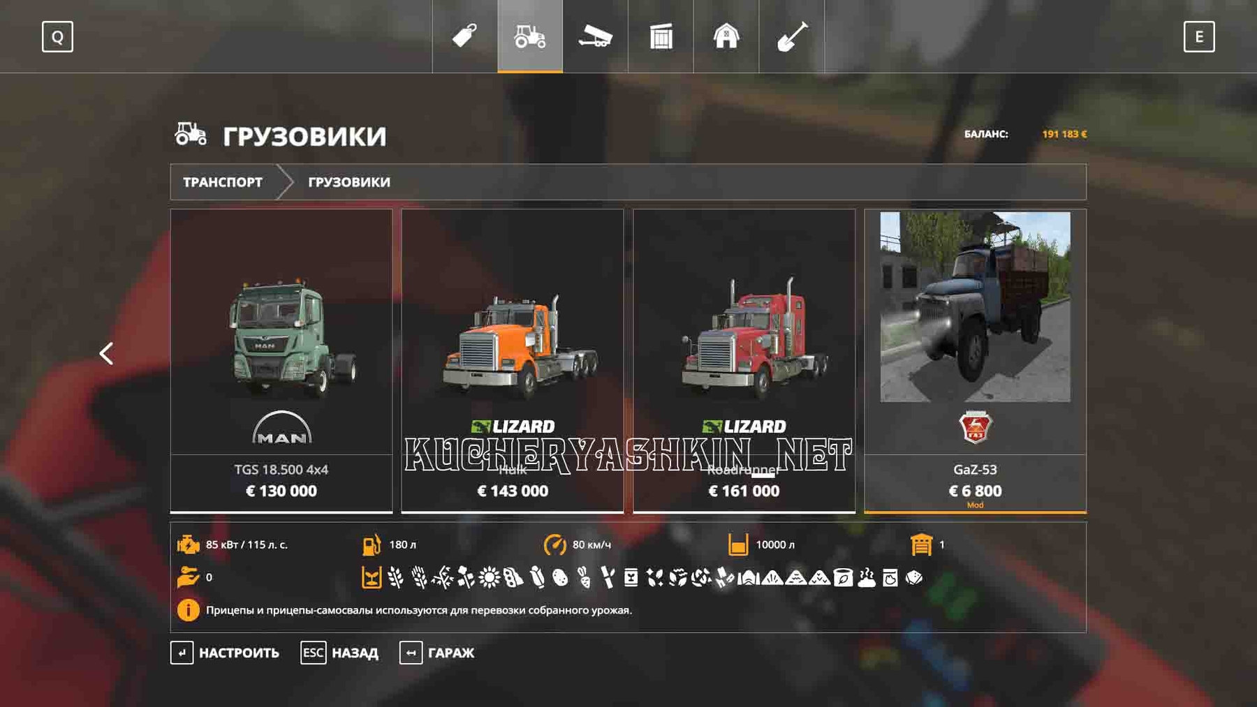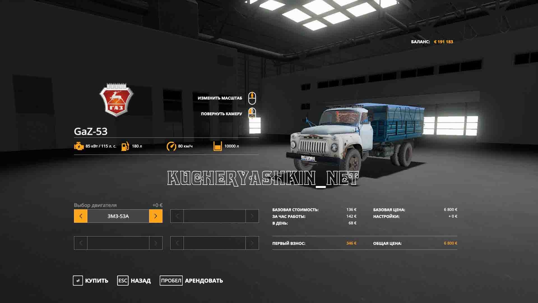 MOD GAZ-53 V1.0.0.0 FOR FARMING SIMULATOR 2019 - Power: 115 hp - Speed: 80 km / h; - Fuel tank volume: 170 l .; - Cost: 6 800 €; - Service cost per day: 0 €; - Engine selection; - Choice of body type; - Removable awning; - Animated devices; - Working lighting equipment; - Working mirrors; - Leaves traces; - Gets dirty and washed; - Body volume: 10,000 liters. Authors: Du-mont TruckerStas, Dufata Northern_Strike, IhorZelenyanskiy, Dizik, ANDREI1994, DiNoX Games. Convert to Fs19: Kucheryashkin
