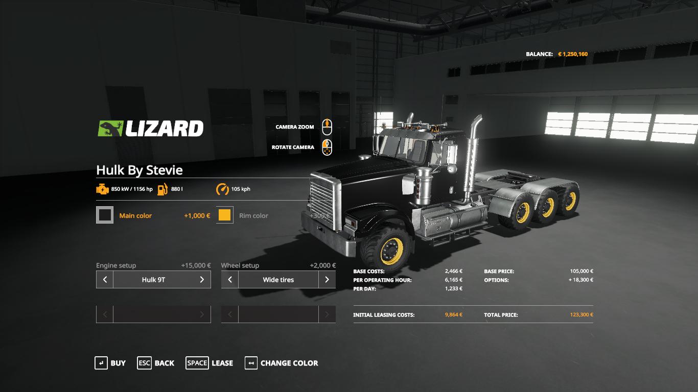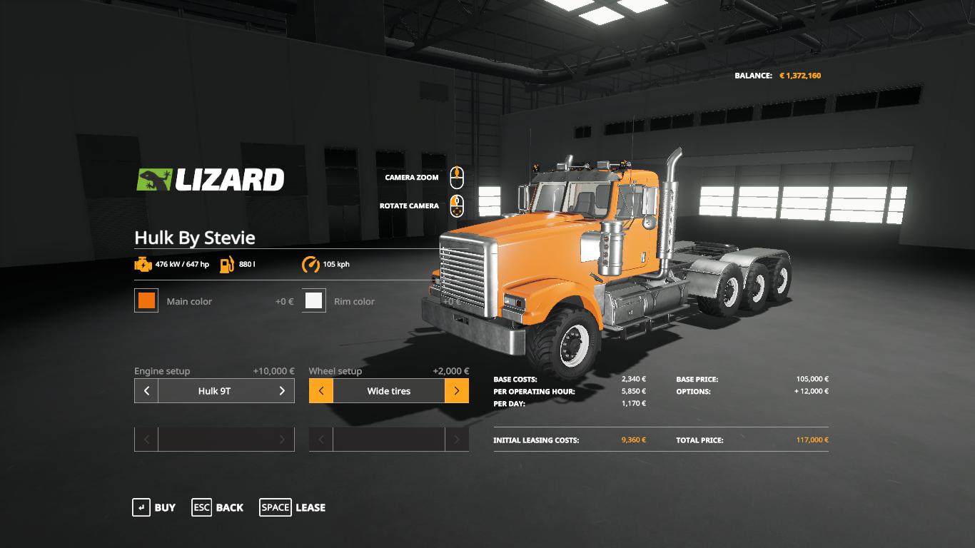 Second up here's the Hulk Semi. Added 3 engine choices up to 1156 BHP, lowered the cost, added beacons, added rear camera, added extra tyre choice and rim colour choice. Adjusted the roll inertia, braking and steering. Have fun with it. Credits: STEVIE |