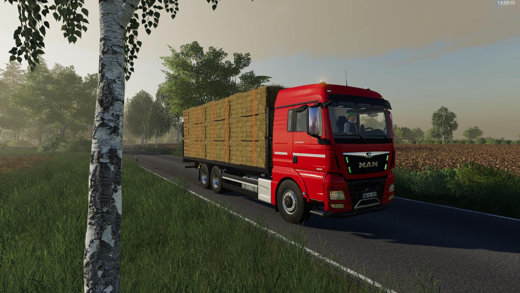 A lorry with a platform for transporting bales, pallets and other dynamic objects, there are mounting belts, lighting, number selection, color selection and other standard features. Credits: ML-Agrardesign, Tim2305, Haubi0105 |