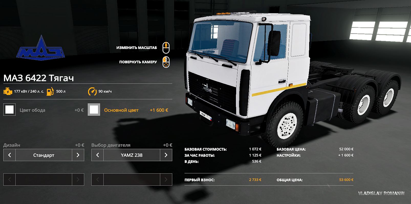 Mod MAZ-6422 Tractor V1.0.0.0 for Farming Simulator 2019 - Power: YaMZ-238 (177 kW / 240 hp) and YaMZ 53602-10 (243 kW / 330 hp); - Speed: 90 km / h; - The volume of the fuel tank: 500 l.; - Cost: 52 000 €; - Cost of service per day: 520 €; - Choice of color of a cabin and wheels; - Different sounds for each engine; - The choice of a peak, and various plates; - Working dashboard; - Working lighting; - Dynamic hoses; - gets dirty and washed; - leaves traces. FS17: Mirage. FS19: VLADISLAV ROMAKIN Credits: VLADISLAV ROMAKIN |