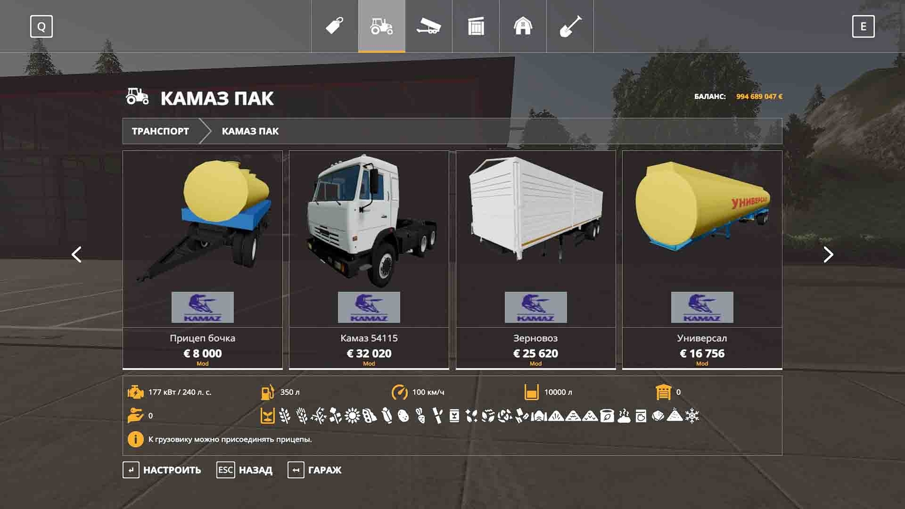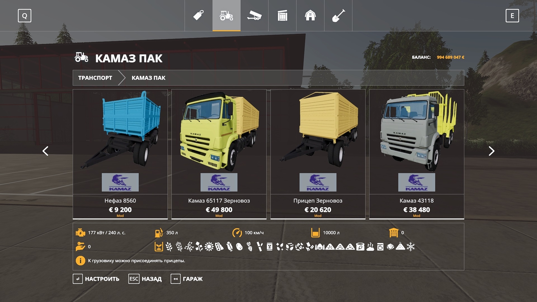The pack includes: - KamAZ-65117 grain truck; - KamAZ-6520 ZSK; - Trailer grain truck; - KamAZ-43118 timber truck; - trailer timber; - KamAZ-54115 tractor; - Semi-trailer grain truck; - Semi-trailer timber truck; - Semi-trailer platform; - Food semitrailer; - KamAZ-53215 barrel; - trailer barrel; - KamAZ-55111 dump truck; - KamAZ-6520 dump truck; - KamAZ-53215 onboard; - Trailer Nefaz-8560; - Tank wagon; - Feldbinder EUT 35.3. Credits: Eraevgenij, Kerl |