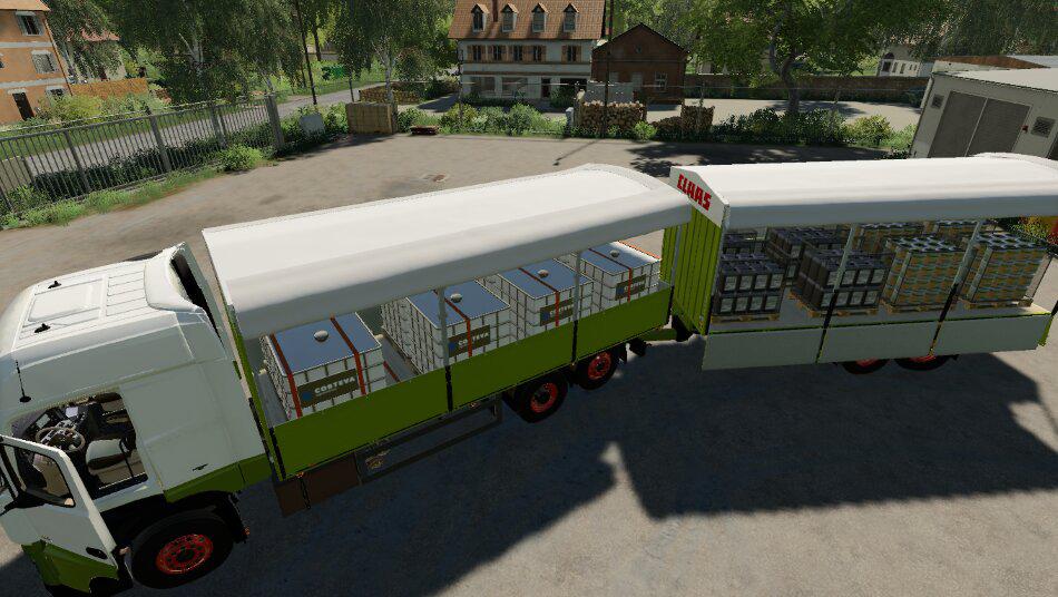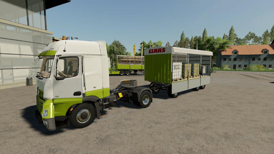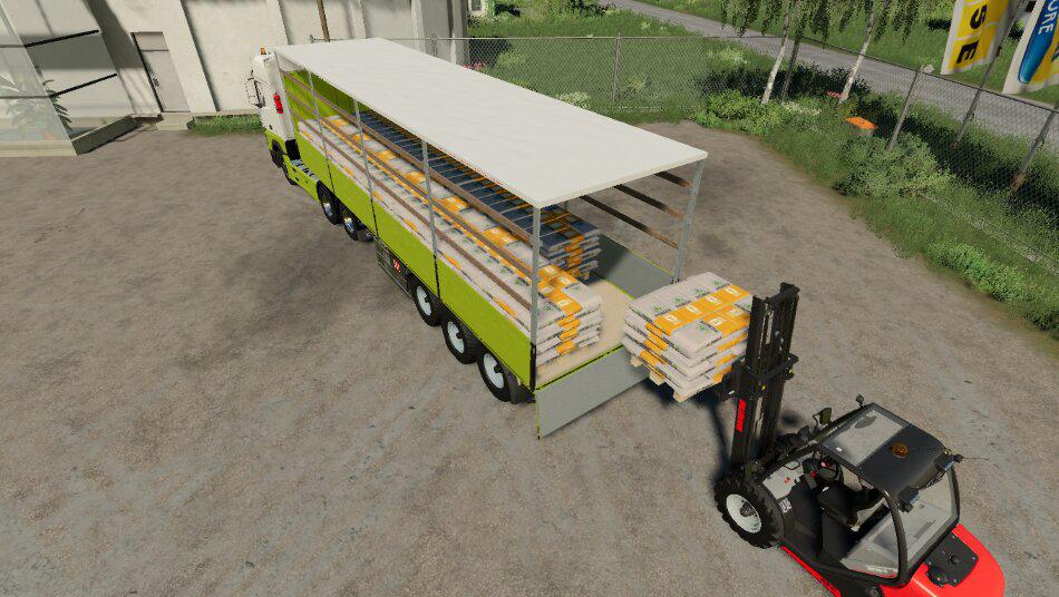 This included 2 trailers: the KOTTE tandem axle and the KRÖGER turntable trailer. Both have awning and autoload function. They are also animated with SIC and buttons. Semi-trailer SCHMITZ-CARGOBULL with 3 axles, the first and third axles can be traversed with SIC. Selection of tires and operation of tarpaulins and sides, warning signs when loading dangerous goods, lighting of the cargo area, etc.