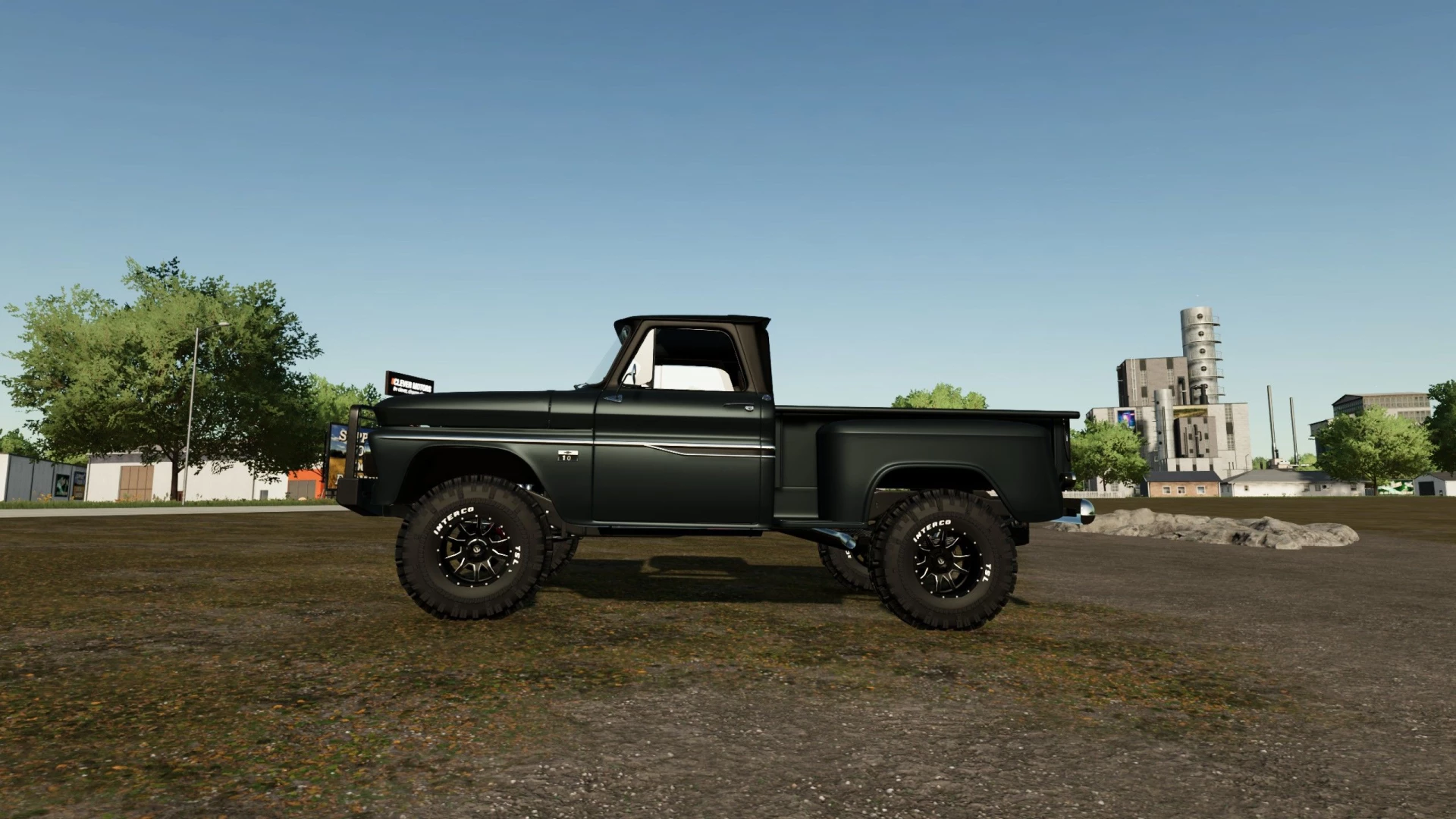 1966 Chevy K10 pickup truck. - Dynamic suspension; - Animated doors, hood, trunk chains; - Detailed HQ engine with 4 BBL, fuel injection and cold air intake; - Simulated exhaust with Flow Master mufflers and glass packages; - TX15 Cannon Truck; - Many design options; - Animated switches.