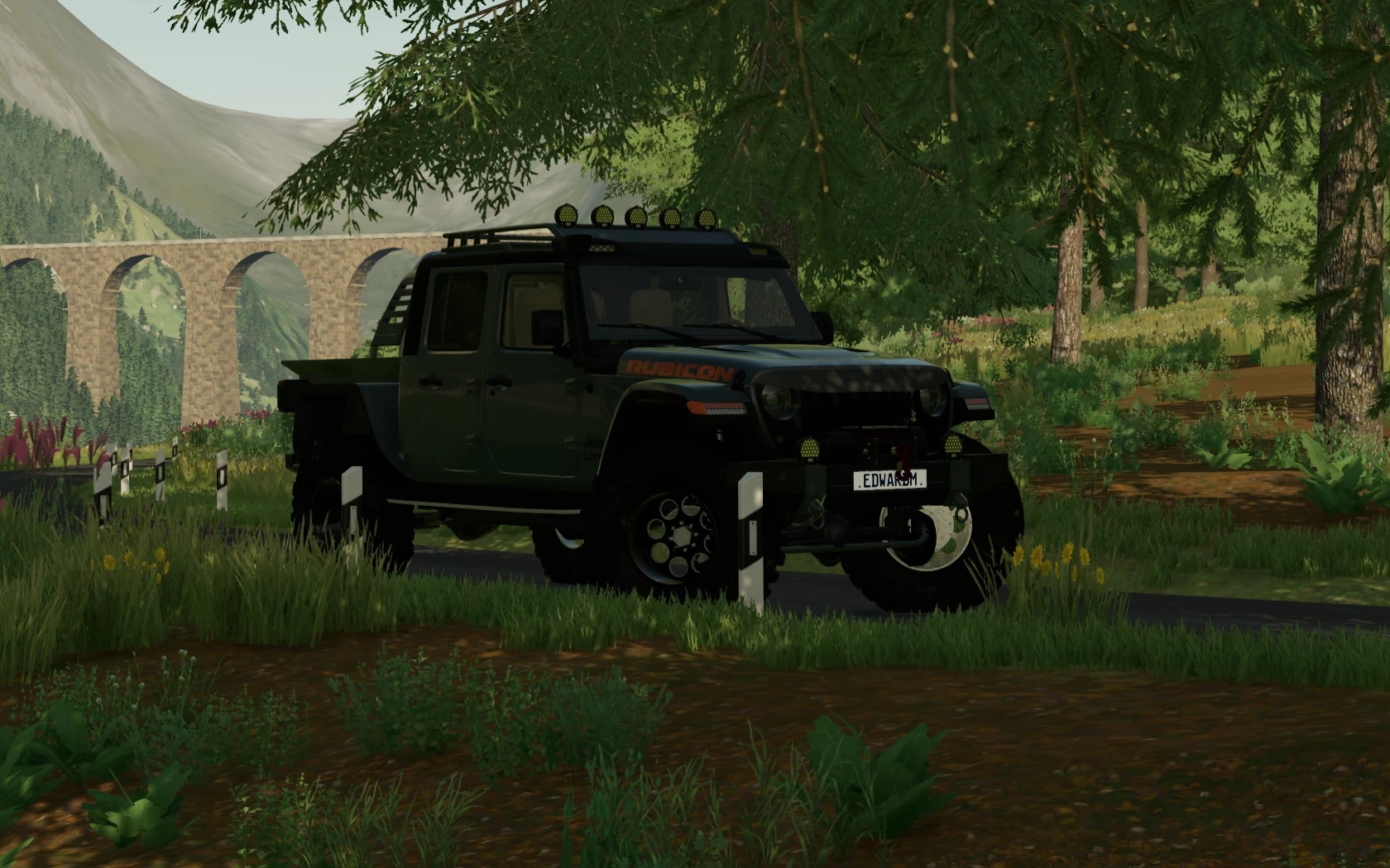 Mod Jeep Gladiator Rubicon v1.0.0.0 for Farming Simulator 2022 - Power: 285/340 hp; — Speed: 120/220 km/h; - goose loop; – Cost: 45000 € Base price; - color selection; - Choice of interior color; - choice of rim color; – multiple design configuration; — engine configuration; - License plate configuration; - Animated, pedals, gooseneck, trunk – Working lighting equipment; - Working mirrors; - leaves traces; - Dirty and washable; – weight configuration; - Animated gooseneck hitch (mouse button) - Wheels move up and down (mouse button) - Wheels in/out (mouse button) _ It is strictly forbidden to edit and publish this mod without my approval!!!! Credits: EDWARD`S MODDING |