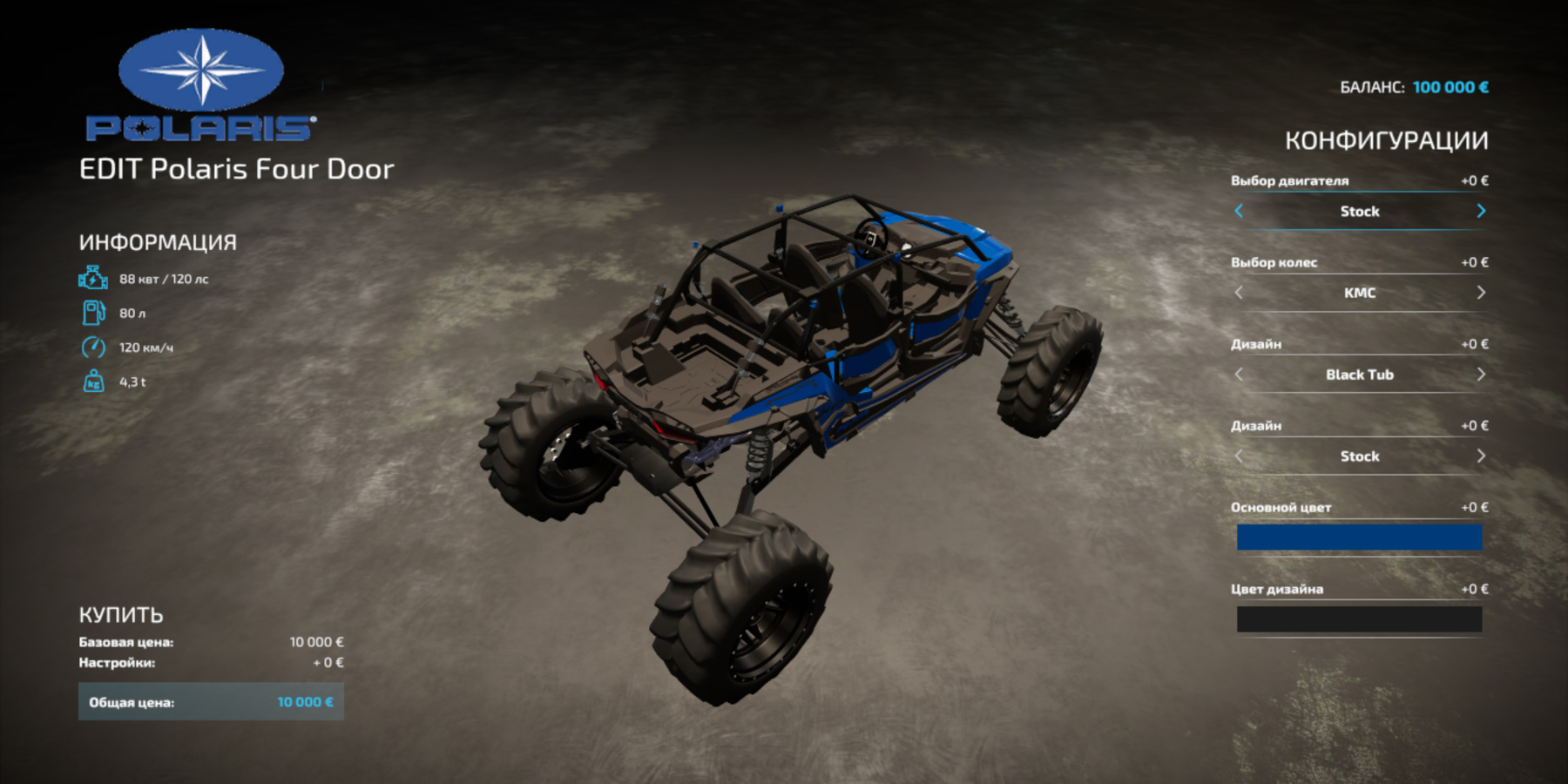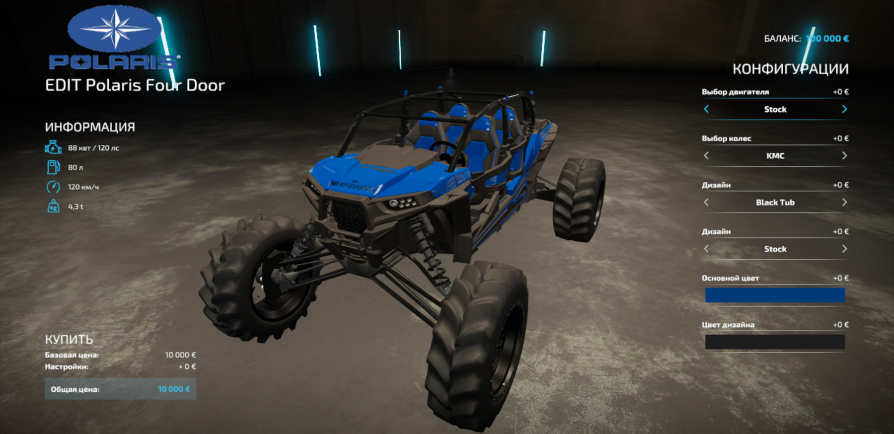 Lifted ATV Polaris RZR 1000. Characteristics: - Price: 10000 y.e.; - Power: 400 HP; - Speed: 120 km per hour; - Working lighting equipment.