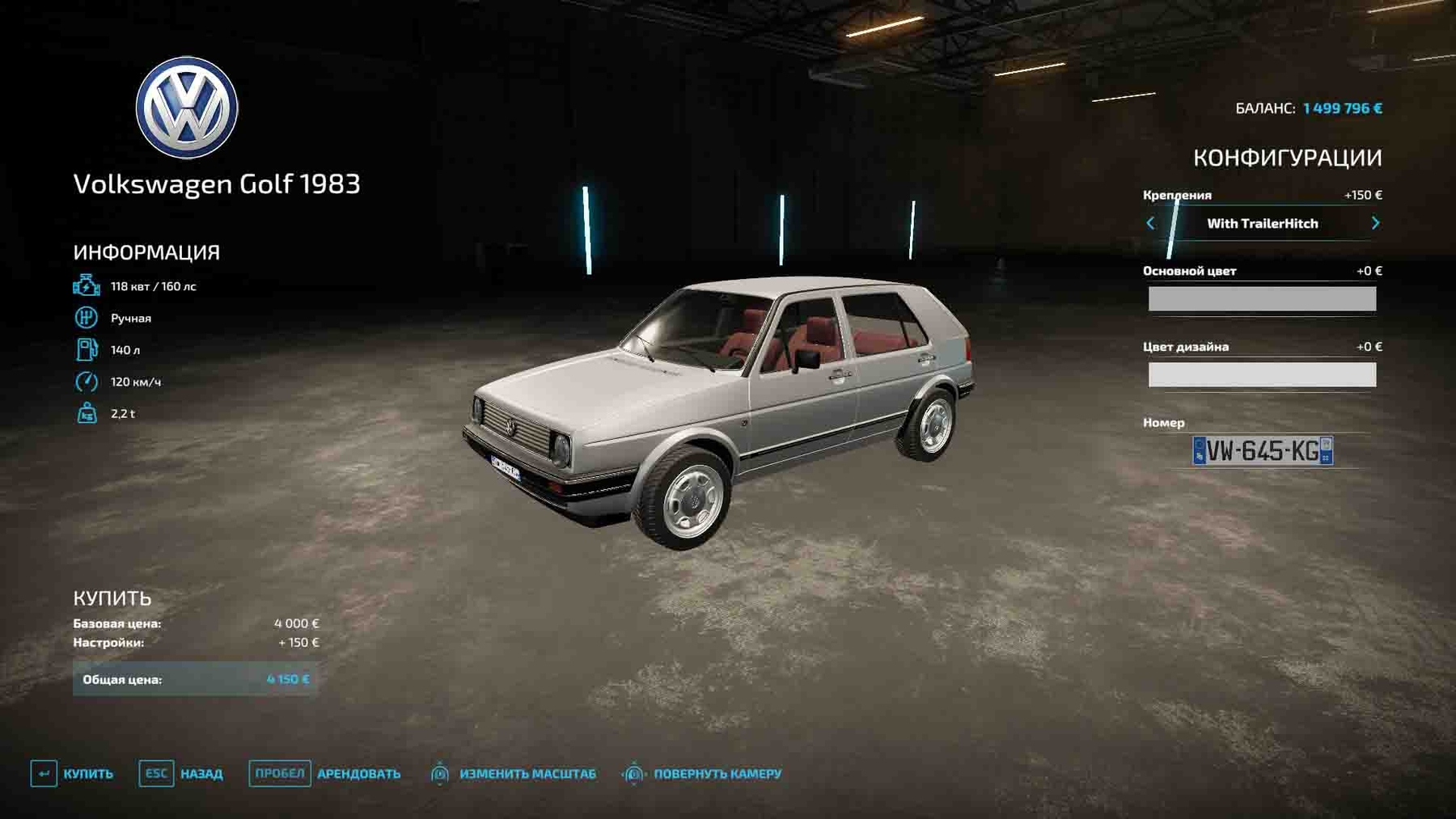 MOD VOLKSWAGEN GOLF GL 1983 V2.0.0.0 FOR FARMING SIMULATOR 2022 - Power: 118 kW / 160 hp; - Speed: 120 km / h; - The volume of the fuel tank: 140 l.; - Cost: 4 150 €; - The choice of the main color; - Choice of rim color; - License plate configuration; - Hitch configuration; - Animated devices, pedals; - Working lighting equipment; - Working mirrors; - Leaves traces from the wheels; - Gets dirty and washed. Changes v2.0.0.0: - Fixed bugs; - Updated shaders; - Animated wipers. Authors: Lezzy, Sheriff Robert, FS22: Gheqor.
