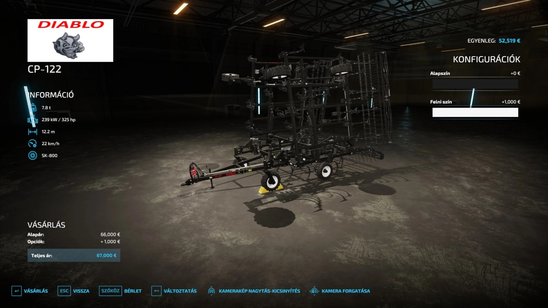 Mod Diablo CultiPlow 122 v1.0.0.1 for Farming Simulator 2022 Working speed: 22 km / h Color selection Cultivator and Plow Price: 66.000 euros New brand Required power: 325 HP