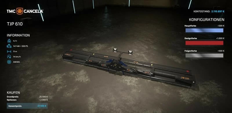 Mod TMC CANCELA TJP 1100 v2.0.0.1 for Farming Simulator 2022 Converted 11m wide mulcher. Version 2.0.0.1 Fixed log warnings New folding function Choice of color of main parts and rims Required power 200 HP Working speed 14 km / h The log is clean!