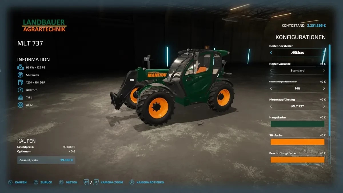 Mod Landbauer MTL737 v1.0.0.0 for Farming Simulator 2022 Landbauer MTL737 is a modification of the Manitou model. If you are looking for an efficient, powerful and comfortable telehandler, the MLT 737 is the right choice. With a power of at least 129 hp, a lift height of 6.88 m and a load capacity of 3.7 t, it is ideal for everyday agricultural transport. There is a choice of 149 PS LE variant, Landbauer's standard color choice for custom design and, as always, all configurations for Landbauer Technik products are included in the purchase price and therefore free of charge. Credits: Landbauer |
