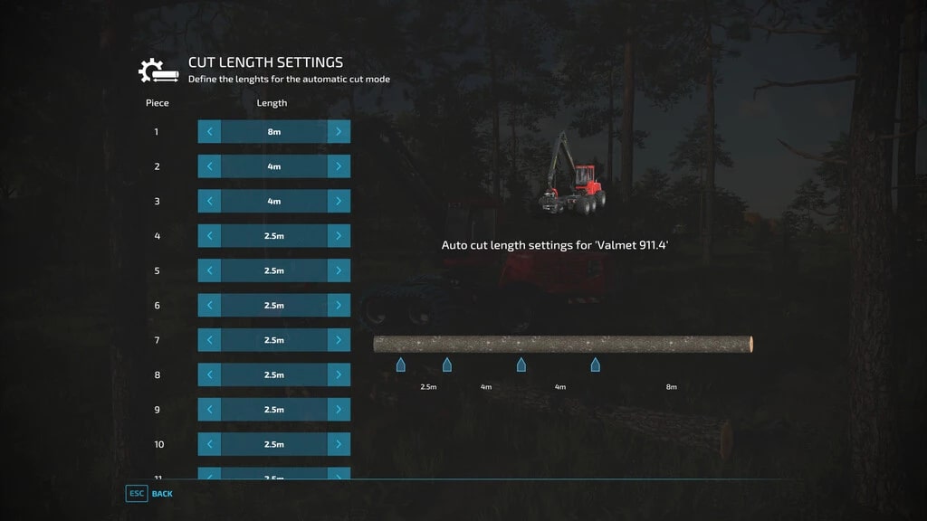 Are you tired of constantly having to switch through the harvester's cutting lengths manually when you want to cut a longer or shorter piece? This script extends the cutting function of a wood harvester by an automatic mode. In a new menu, you can define how the logs will be cut. Example: First piece 12m, second piece 3m, third piece 2m (...). By pressing a button, the tree gets cut and the cut length then changes to the next defined value. Hold the button to automatically process the whole tree. Default key bindings: Open cut lengths menu: "ctrl + w" Cut (automatic): "ctrl + x" (hold to process the whole tree) Credits: Vector Man |