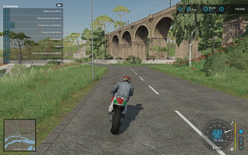 Animation of dashboard lighting, digital tachometer, rev limiter display, digital speed display, fuel gauge, time display (time in game), gear shift display, temperature display, all lights on when engine starts, steering wheel movement, driver head movement during acceleration and stopping, leaning the motorcycle to the side when cornering, keeping the rider's eyes level, simulating road roughness, ... .