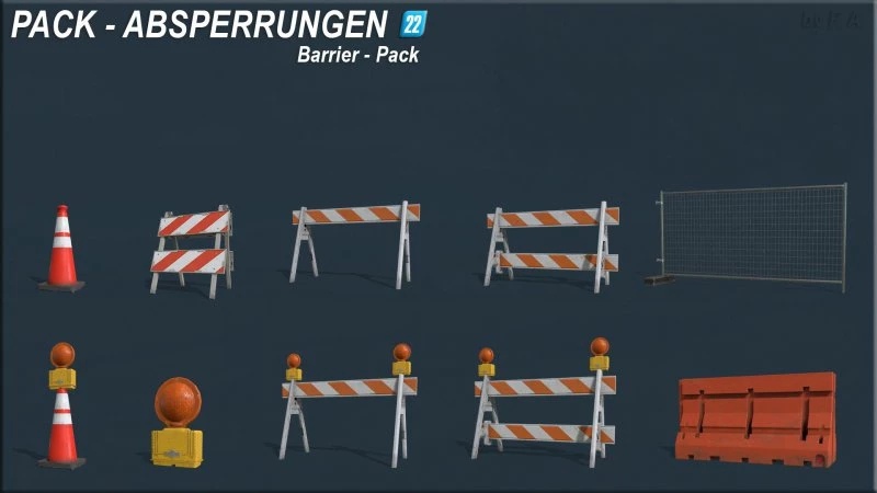 Mod BARRIER Pack v1.0.0.0 for Farming Simulator 2022 Portable barrier package for the protection of construction sites. • Motion cone 25 € (with strobe + 64 €) • Barrier (single) 40 € (with strobe + 64 €) • Barrier (small) 50 € • Barrier (double) 50 € (with strobe + 64 €) • Barrier fence 120 € • Plastic barrier. 165 € • Flashing light 64 €