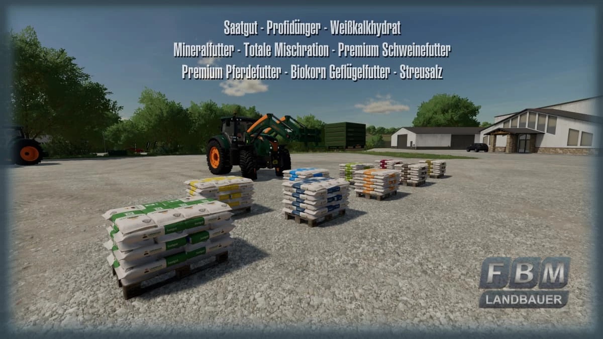The set of farm agricultural products includes many products of modern agriculture, which can be bought in the store. There is a multiple choice for all products, and if you buy more than five products at the same time, you will receive a discount of 5% of the total cost. All products are marked "Made in Germany", i.e. products marked in German and listed below. Content: ● Large bag of seeds, 1250 liters, 849 euros. ● Large bag of professional fertilizer, 1250 liters, 749 euros. ● Large bag of white hydrated lime, 2000 liters, 199 euros. ● Big Bag Premium feed for pigs, 1250 liters, 749 euros. ● Big Bag Premium feed for horses, 1250 liters, 1249 euros. ● Biokorn Big Bag for poultry feed, 1250 liters, 549 euros. ● Can be found in the game in the section: Store/Items/Large bags. ● Seed tray, 2400 liters, 1649 euros. ● Professional fertilizer tray, 2400 liters, 1449 euros. ● A pallet of white hydrated lime, 2400 liters, 249 euros. ● Pallet with road salt, 2400 liters, 249 euros. ● Pallet of mineral nutrition, 2000 liters, 849 euros. ● Total Mixed Ration (TMR) pallet, 2000 liters, 1049 euros. ● Premium feed assortment for pigs, 2000 liters, 1249 euros. ● Range of premium horse feed, 2000 liters, 1999 euros. ● Poultry food Palette Biokorn, 2000 liters, 795 € ● Bigroflow tank (liquid fertilizers), 2000 liters, 1799 euros. ● Tank of Qucides (herbicide), 2000 liters, 1999 euros. ● SilFix canister (silage additive), 25 liters, 89 € ● Container of organic fertilizer (manure), 2000 liters, 79 € ● Can be found in the game in the section: Shop / Objects / Palettes. ● All products have multiple choice (quantity) in the store ● Languages: German, English, French, Italian, Polish. ● Mod file size: 9.64 MB. Credits: Landbauer |