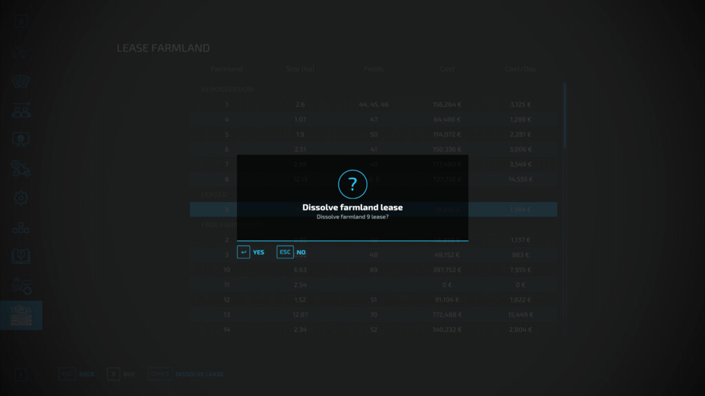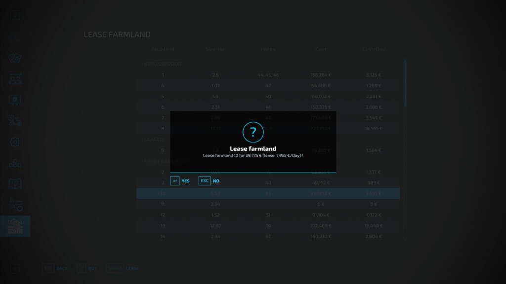 Mod FIELD LEASE V1.1.0.0 for Farming Simulator 2022 You have no money to buy fields? changelog: No problem! Then simply lease some. At the beginning of the lease you have to pay 2% of the purchase price for administration etc.. After that you have You can lease plots in the game menu. Note that a plot can have several fields and the field number does not have to be the plot number! Credits: KR-Softwares |