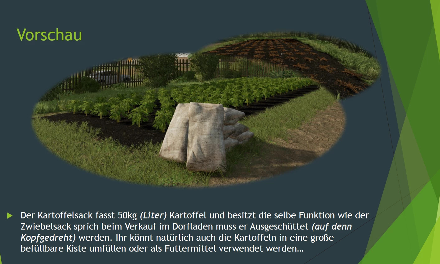 Mod Hof Bergmann allotment planting potatoes v1.0.0.0 for Farming Simulator 2022 It can be produced on all beds using this potato mod. The installation of the mod can be found in the attached instructions. Make a backup copy of Hof Bergmann or exchange files. good luck farming Credits: Deathartist |