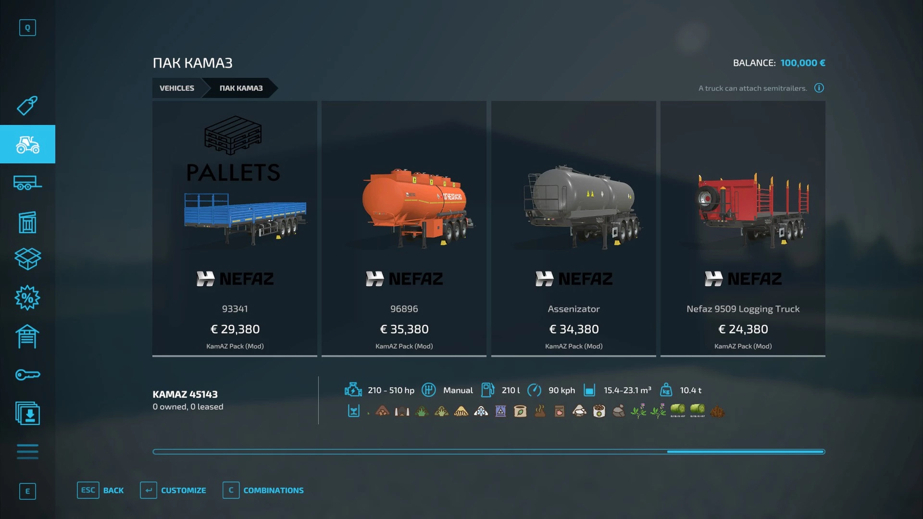 Pak KamAZ-s and trailers for them. Included: Trucks KAMAZ: Amkar 65117 45143 Food Trailers Nefaz 55111 9509 93341 96896 Assenizator Nefaz 9505 Timber carrier 8560
