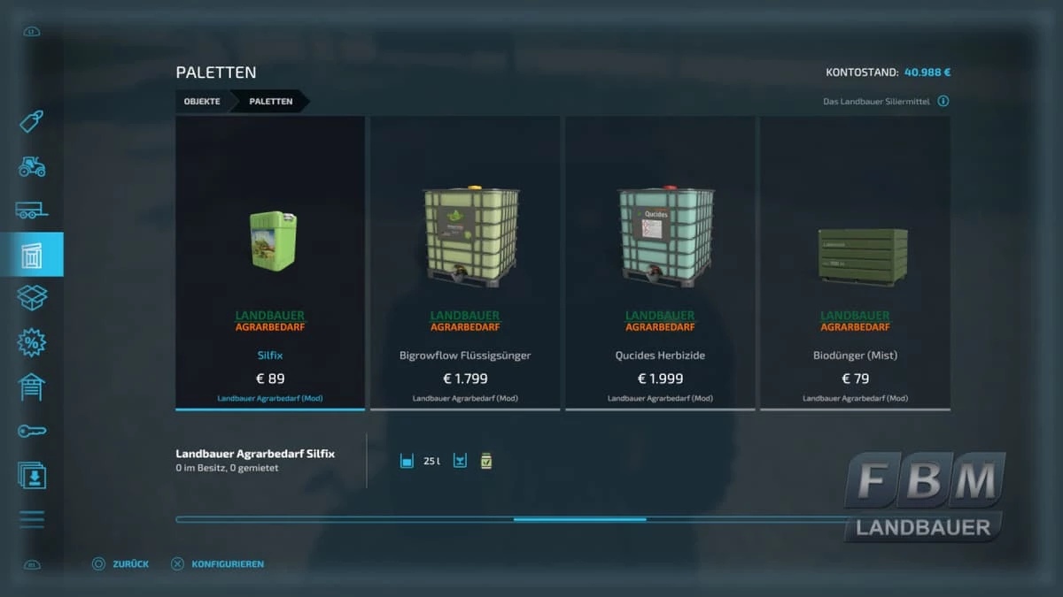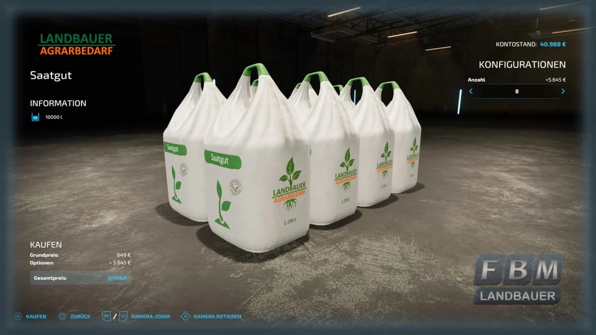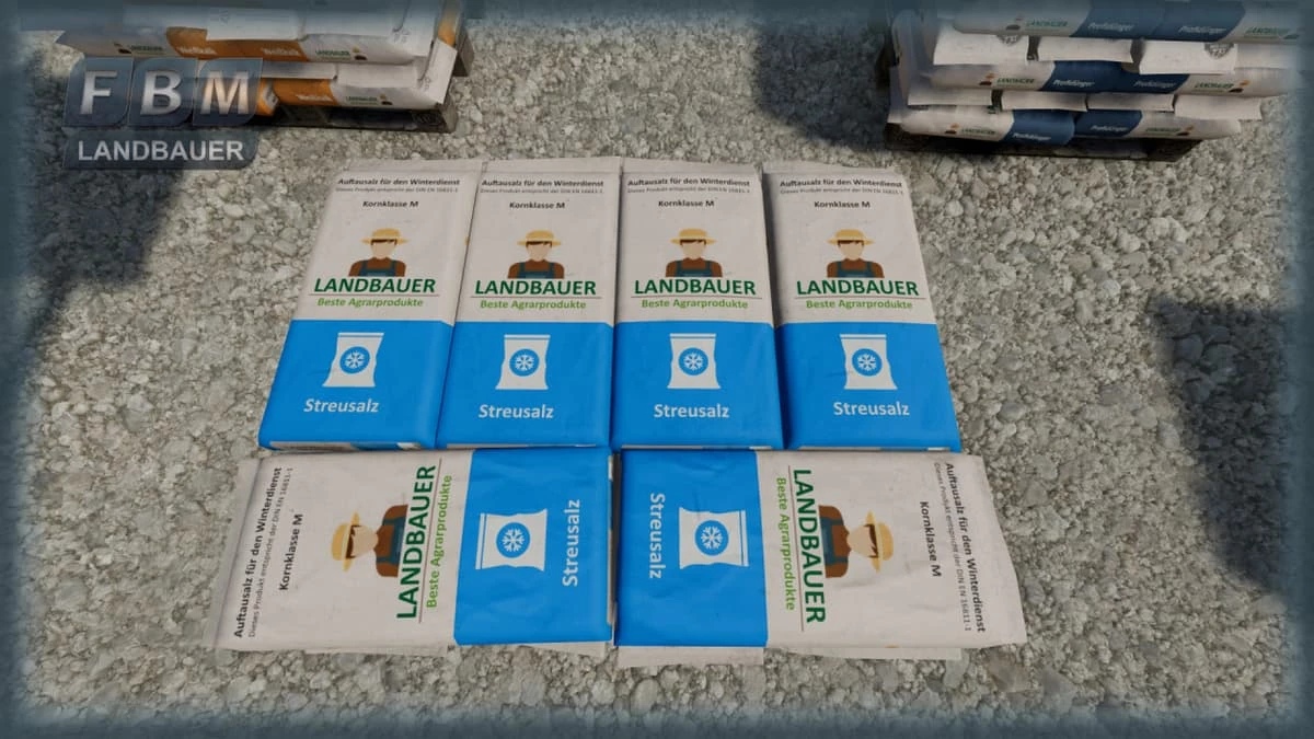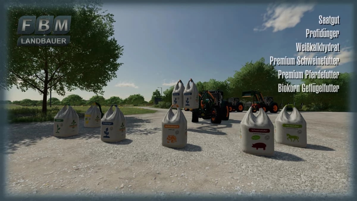 Contents: ● Big bag of seeds, 1,250 liters, €849 ● Big bag of professional fertilizer, 1,250 liters, €749 ● Big bag of white lime hydrate, 2,000 liters, €199 ● Big Bag Premium pig feed, 1,250 liters, €749 ● Big Bag Premium horse feed, 1,250 liters, €1,249 ● Big Bag Biokorn poultry feed, 1,250 liters, €549 ● To be found in the game under: Shop / Objects / Big Bags ● Pallet of seeds, 2,400 liters, €1,649 ● Professional fertilizer pallet, 2,400 liters, €1,449 ● Pallet of white lime hydrate, 2,400 liters, €249 ● Pallet of road salt, 2,400 liters, €249 ● Pallet of mineral feed, 2,000 liters, €849 ● Total Mixed Ration (TMR) pallet, 2,000 liters, €1,049 ● Premium pig feed range, 2,000 liters, €1,249 ● Premium horse feed range, 2,000 liters, €1,999 ● Palette Biokorn poultry feed, 2,000 liters, €795 ● Tank Bigroflow (liquid fertilizer), 2,000 liters, €1,799 ● Tank Qucides (herbicide), 2,000 liters, €1,999 ● Canister SilFix (silage additive), 25 liters, 89 € ● Container of organic fertilizer (manure), 2,000 liters, €79 Additional Information: The farmer container (organic fertilizer) can be loaded as a pallet with autoload Credits: Landbauer |