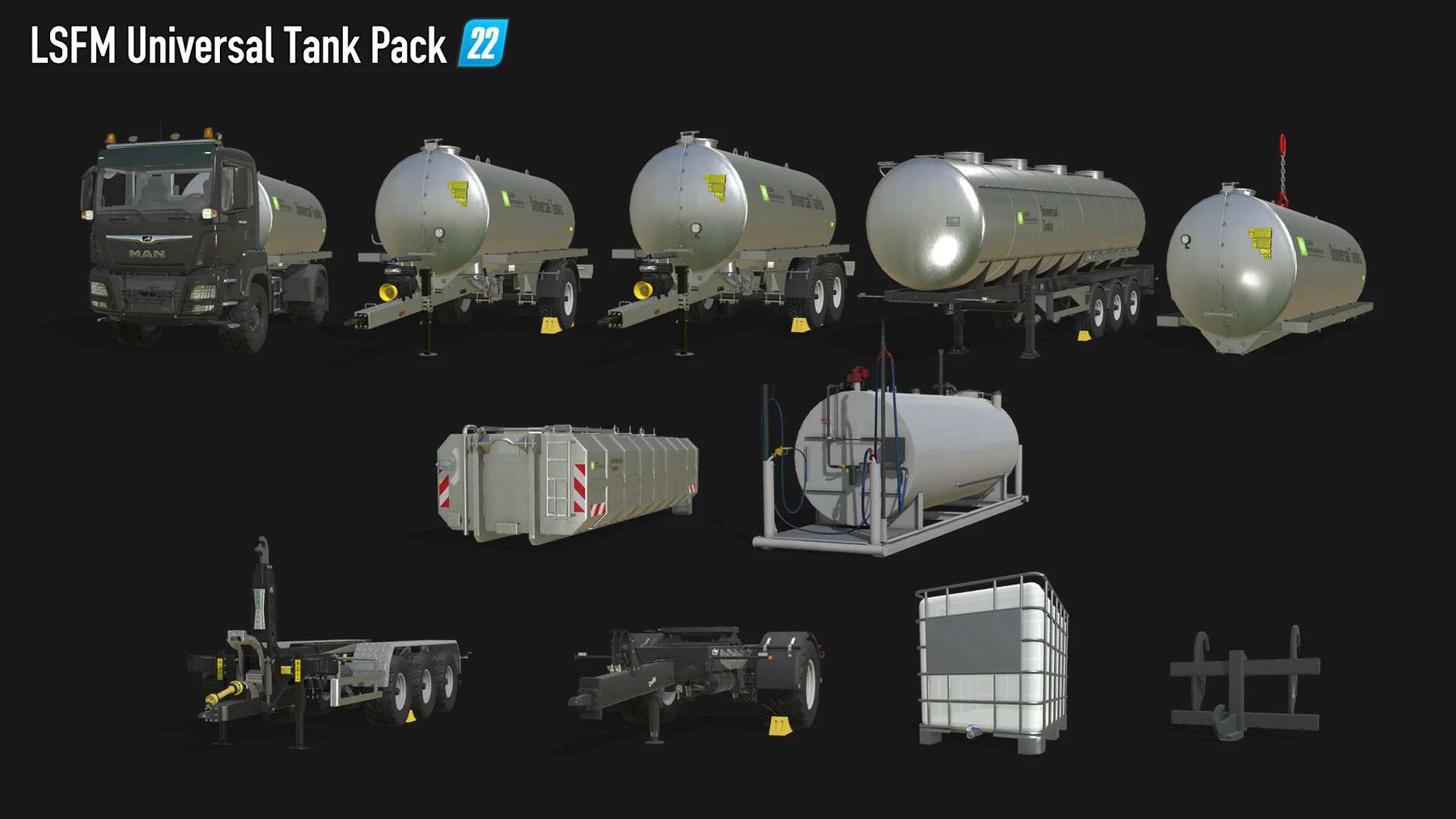 Mod LSFM Universal Tankpack v1.0.0.5 for Farming Simulator 2022 Universal tank-pack, storage and transportation of various liquids.
