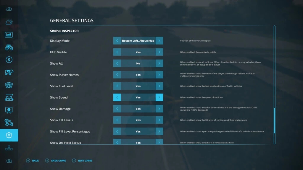 Simple Inspector shows a HUD overlay with vehicle statistics v1.0.1.6 - Bugfix: text was still visible when HUD was toggled off. Credits: JTSage |