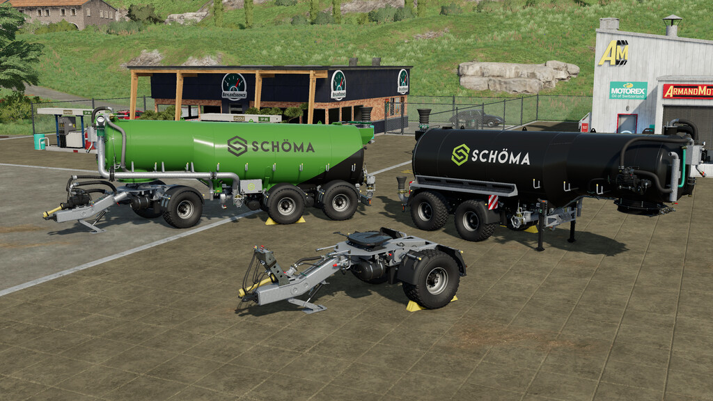 This pack contains vehicles around a massive slurry tanker from Schöma in northern Germany. Thanks to the conical tank, a very low center of gravity and super stability on the road can be realized.